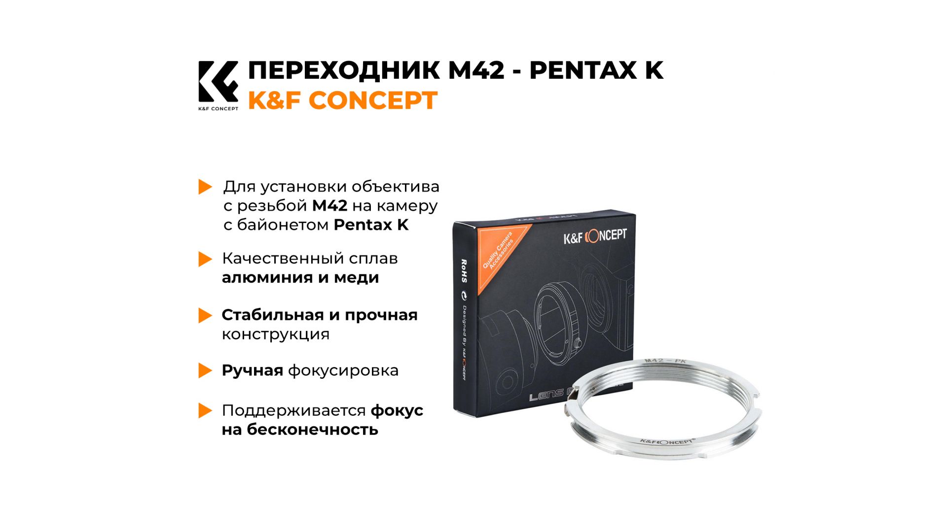 Механический адаптер K&F Concept предназначен для установки объективов с резьбой M42 на камеры с байонетом Pentax K. Этот адаптер выполнен из высококачественного алюминиево-металлического сплава, что гарантирует прочность и долговечность. Фокусировка с данным переходником осуществляется вручную, при этом поддерживается возможность фокусировки на бесконечность, что делает его идеальным для различных съемочных задач. Переходник не поддерживает автофокус, но его механическая конструкция обеспечивает точность и стабильность при использовании.