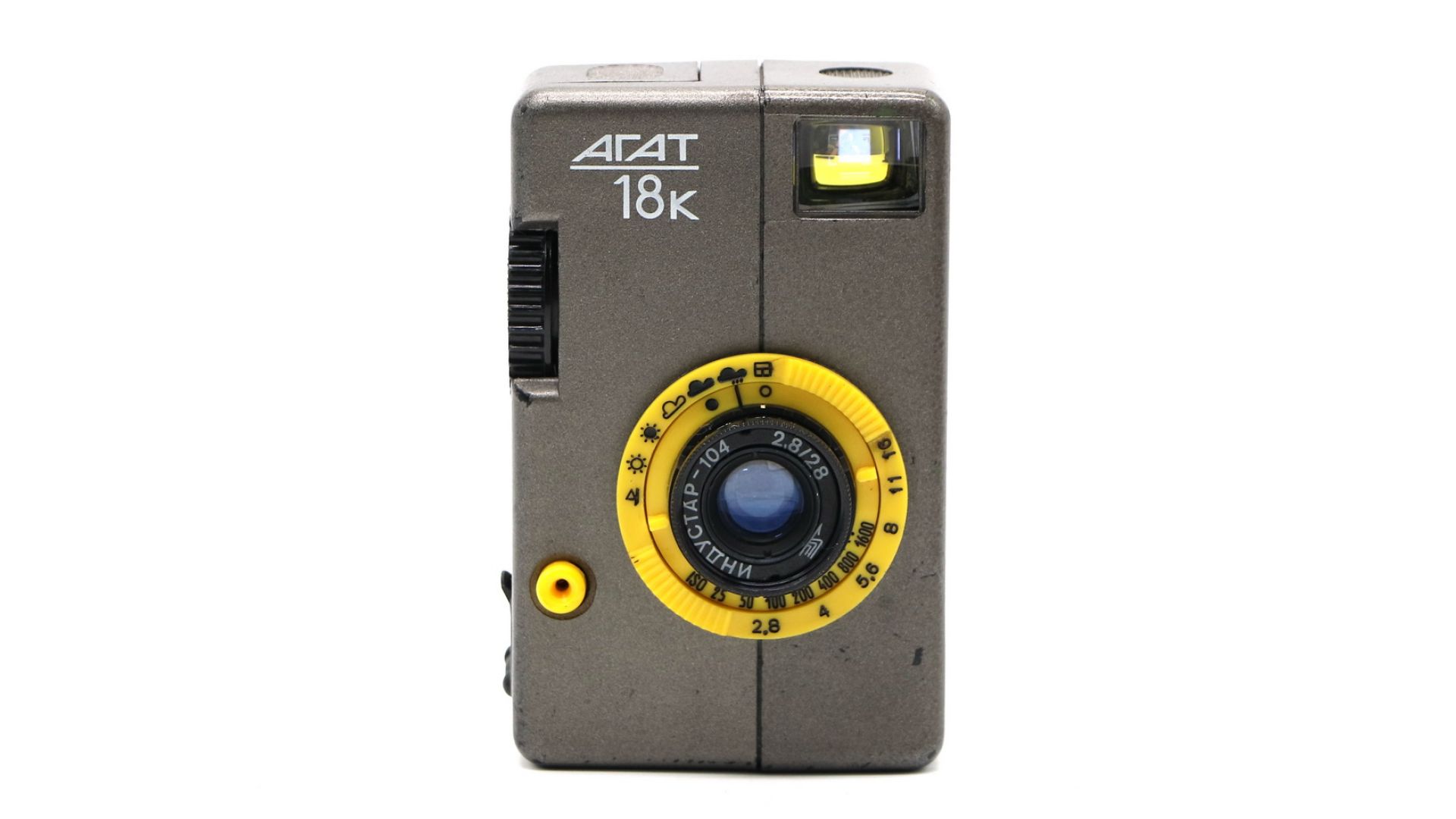 Корпус фотоаппарата пластмассовый разъёмный, зарядка 35-мм фотоплёнкой в стандартных кассетах. Взвод затвора сблокирован с перемоткой плёнки, счётчик кадров — автоматический. Объектив «Индустар-104» 2,8/28, несъёмный. Наводка на резкость по шкале расстояний от 0,9 м до бесконечности. Имеется шкала глубины резкости в виде выемок обоймы объектива. Разрешающая способность : 40 лин/мм в центре кадра, 22 лин/мм по краям. Установка экспозиции — ручная по символам погоды. Видоискатель камеры имеет запас по полю зрения. Агат 18К - настоящая камера шпиона, он настолько маленький, что способен поместиться абсолютно в любой карман.