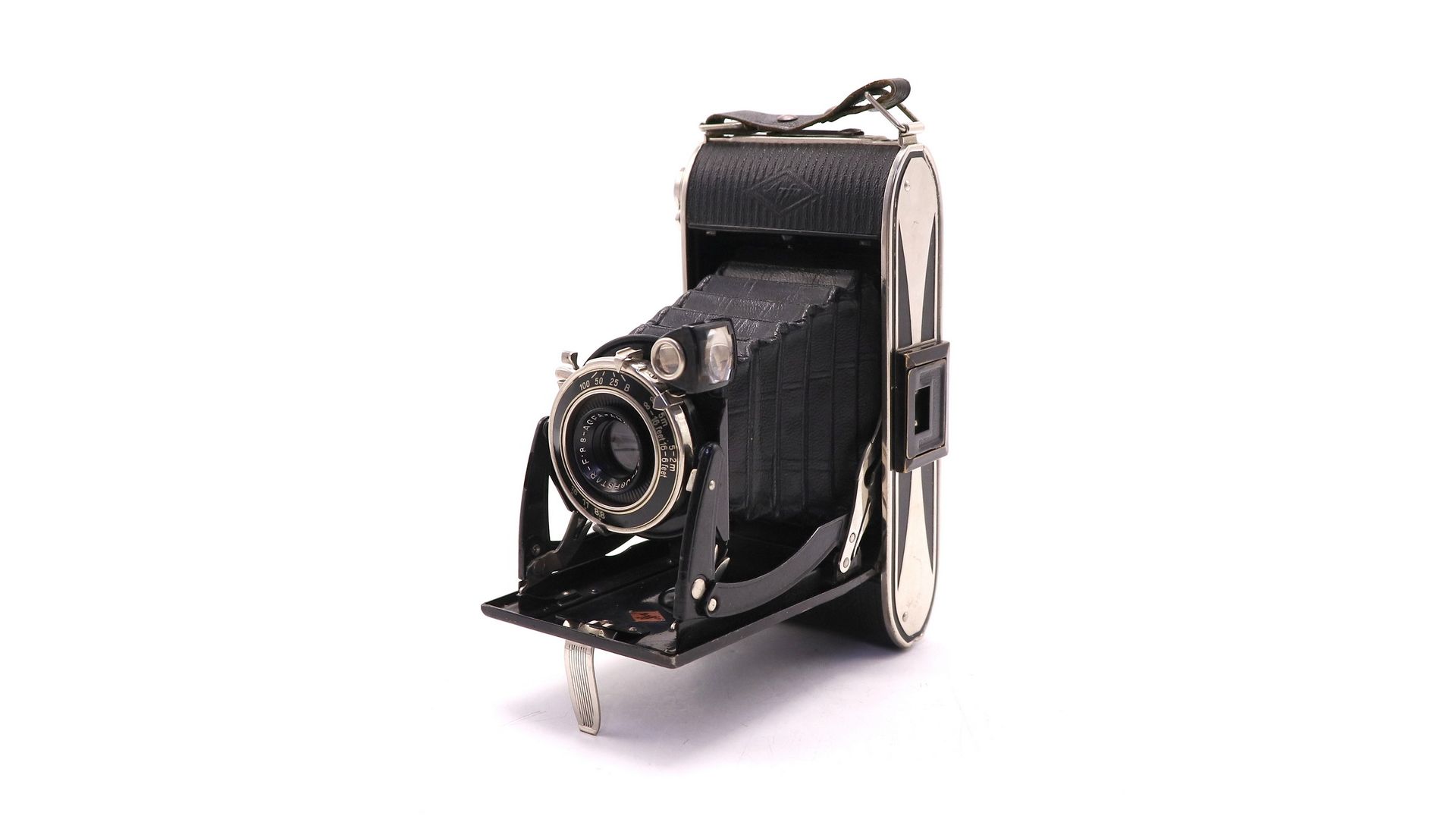 Объектив Agfa-Anastigmat Jgestar f/8.8 с фиксированной апертурой обеспечивает чёткие снимки с хорошей детализацией и характерным винтажным стилем.