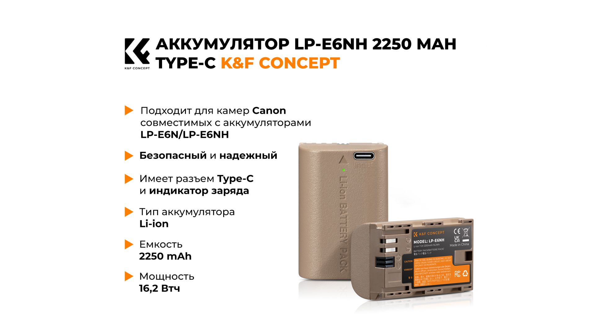Новый аккумулятор от производителя K&F Concept LP-E6NH с емкостью 2250mAh.