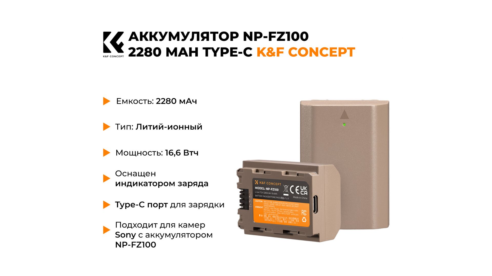 Новый аккумулятор от производителя K&F Concept NP-FZ100 с емкостью 2280mAh.