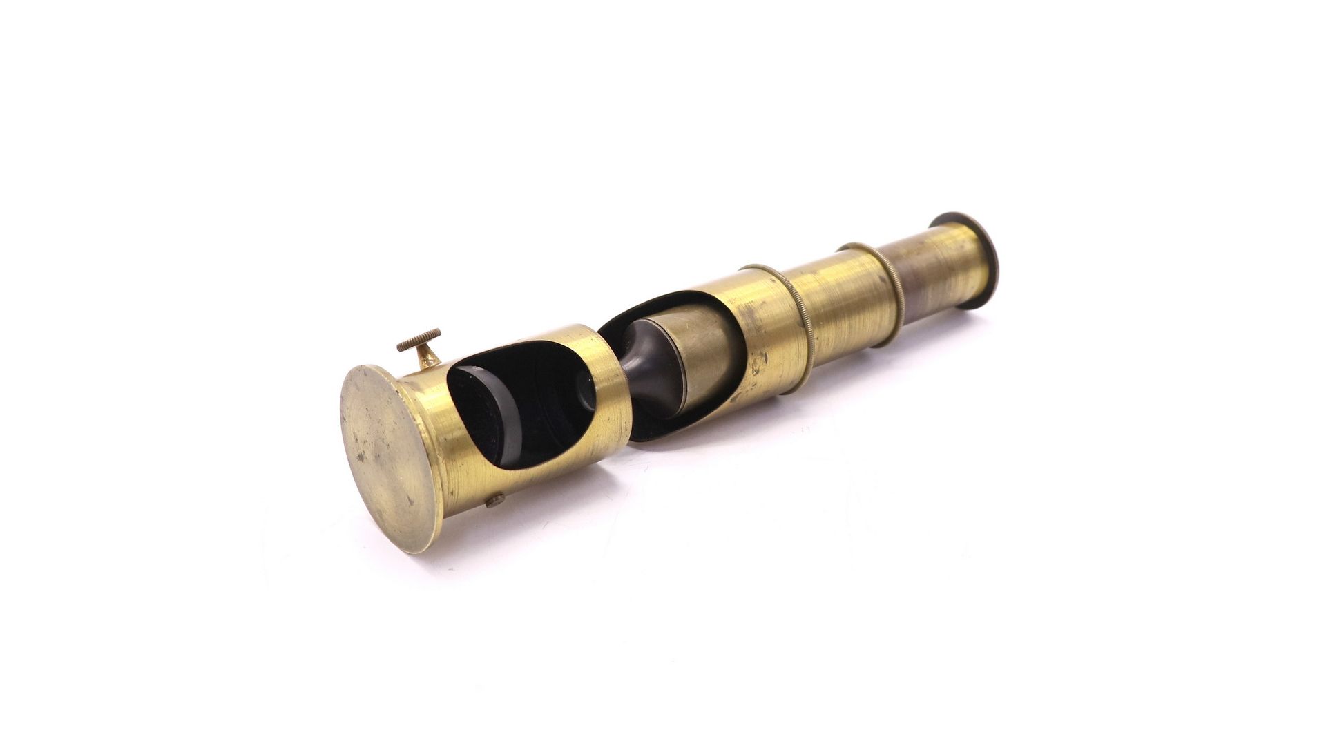 Микроскоп состоит из латунного цилиндра, который скользит внутри трубки из того же металла, и включает окуляр, линзу и зеркало для отражения света.