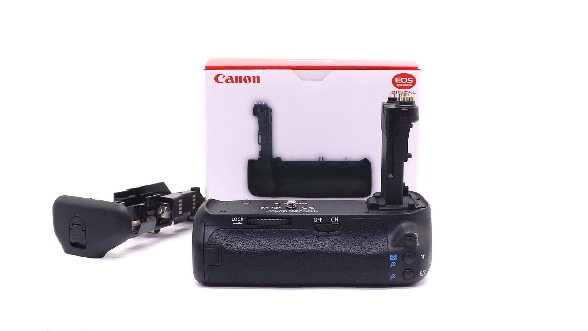 Эргономичная конструкция рукоятки батарейного блока позволяет более удобно держать фотокамеру при съёмке в вертикальном положении. В качестве источника питания блока используются шесть стандартных батарей типа АА или две аккумуляторные батареи LP-E6. Для удобства съёмки вертикальных кадров, на рукоятке расположены дополнительная спусковая кнопка затвора, кнопка АЕ lock/FElock, кнопка включения автофокуса, а также диск управления. Имеется встроенный разъём для крепления штатива.