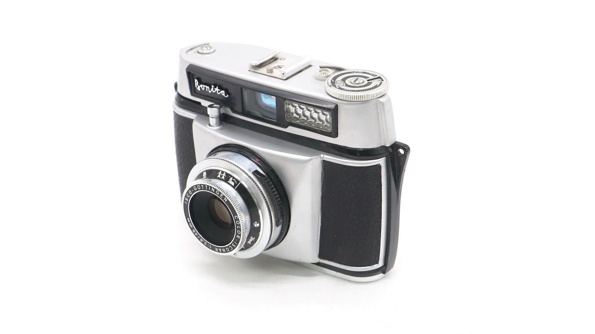 Алюминиевый корпус, серая кожа. Оснащен объективом Isconar 1:2,8 / 45 мм. Размер кадра 24 х 36 мм. Интересный экземпляр для коллекции и фотоэкспериментов.