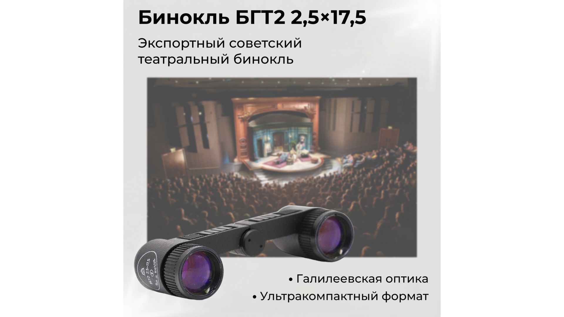 Бинокль БГТ2 2,5×17,5 — галилеевская театральная модель из металла с индивидуальной фокусировкой для каждого глаза. Производился на Лыткаринском заводе исключительно для экспорта, отличается высоким качеством сборки и отборной оптикой.