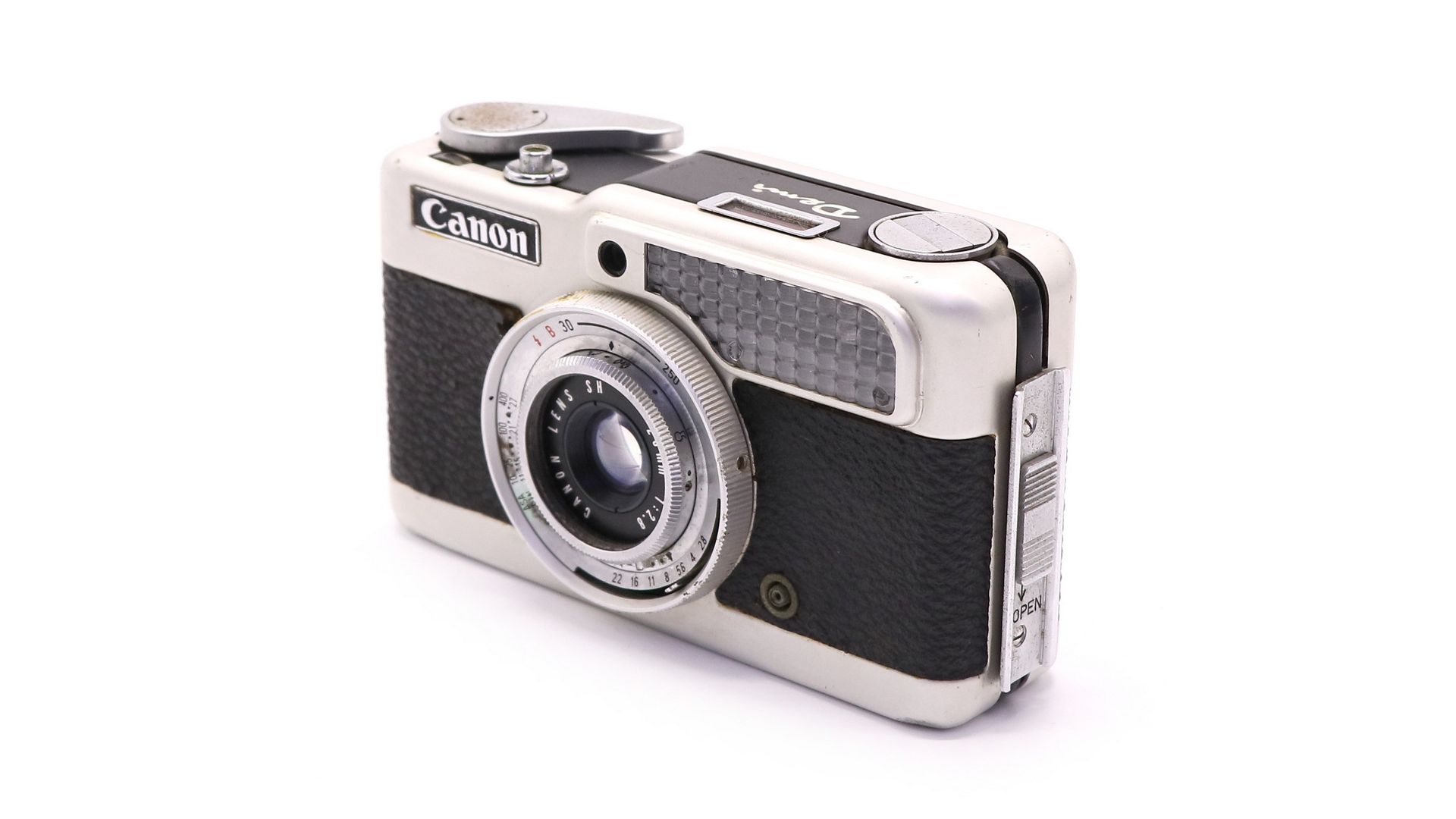 Canon разработали свою версию полукадрового фотоаппарата, назвав ее Canon Demi уже когда Olympus-Pen была лидирующей камерой в Японии, использовавшей формат половины 35мм кадра. Полукадр позволил увеличить возможное количество кадров на одной катушке с пленкой в 2 раза. Фотоаппарат имеет экспонометр, прямой видоискатель, объектив с фокусным расстоянием 28 мм и минимальным значением диафрагмы в 1:2.8. Размер кадра 24х18 мм.