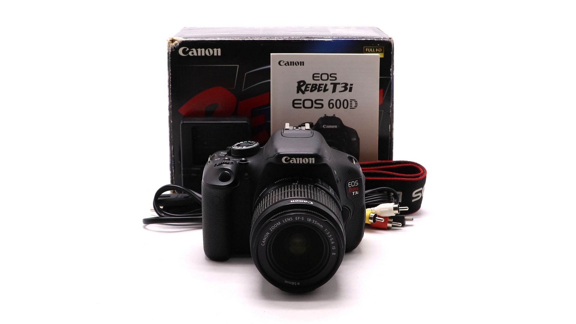 Комплектация:Коробка, документы, аккумулятор, зарядное устройство, объектив Canon EF-S 18-55mm 3.5-5.6 IS II, крышка объектива, AV-кабель.