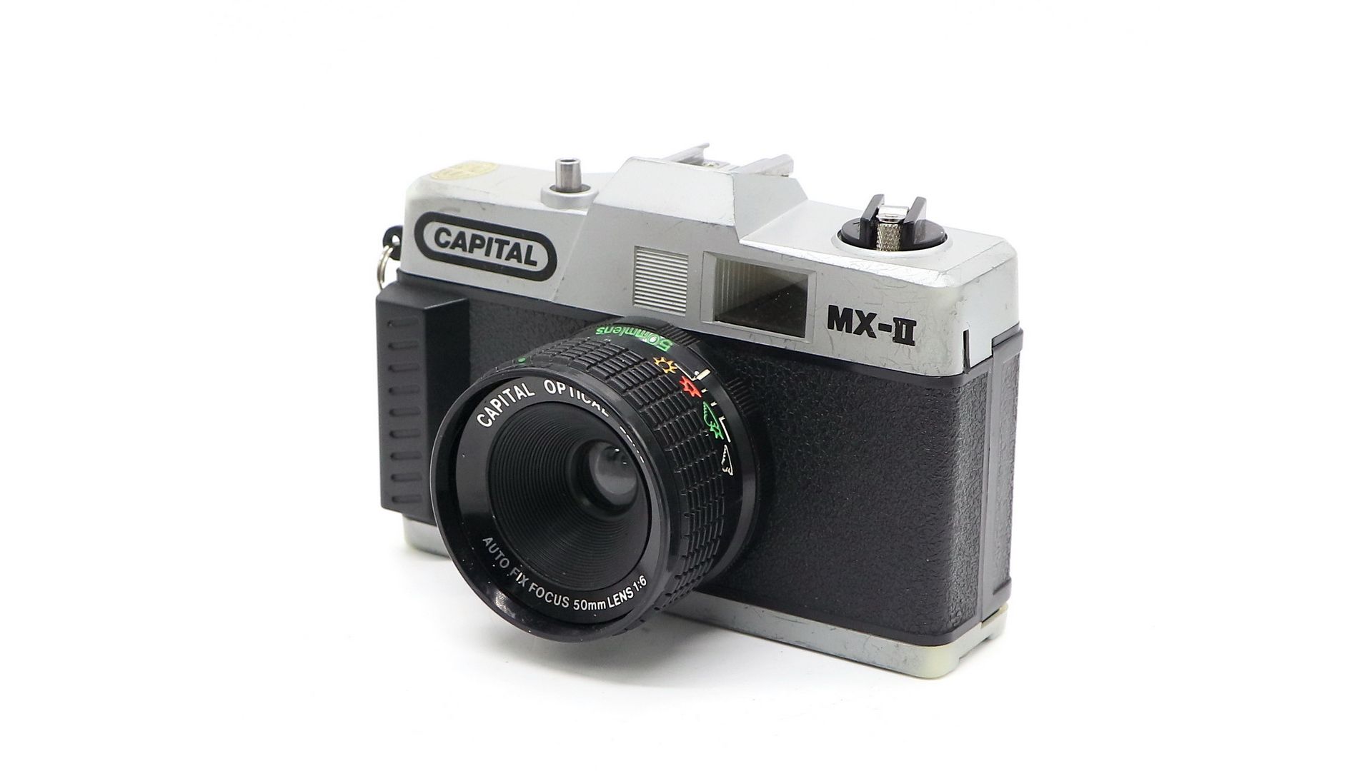 Камера с объективом Capital 50 мм 1.6 с оптическим автофиксом фокуса, со значками погоды для настройки диафрагмы. Тип пленки - 135мм. Размер кадра 24x36.