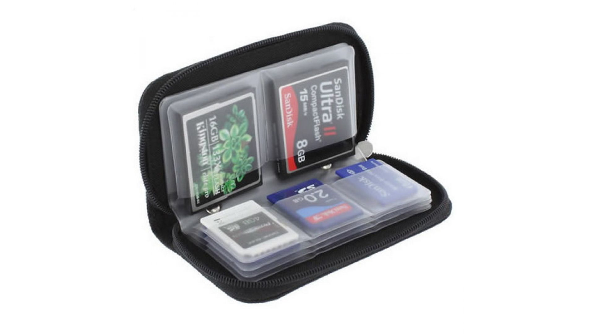 В чехол могут быть помещены: SD карты, мини-SD карты, карты микро SD, XD карты, MMC карты, CF карты, карты SmartMedia, Memory карты Pro Duo Стик, Microdrive миниатюрный жесткий диск.