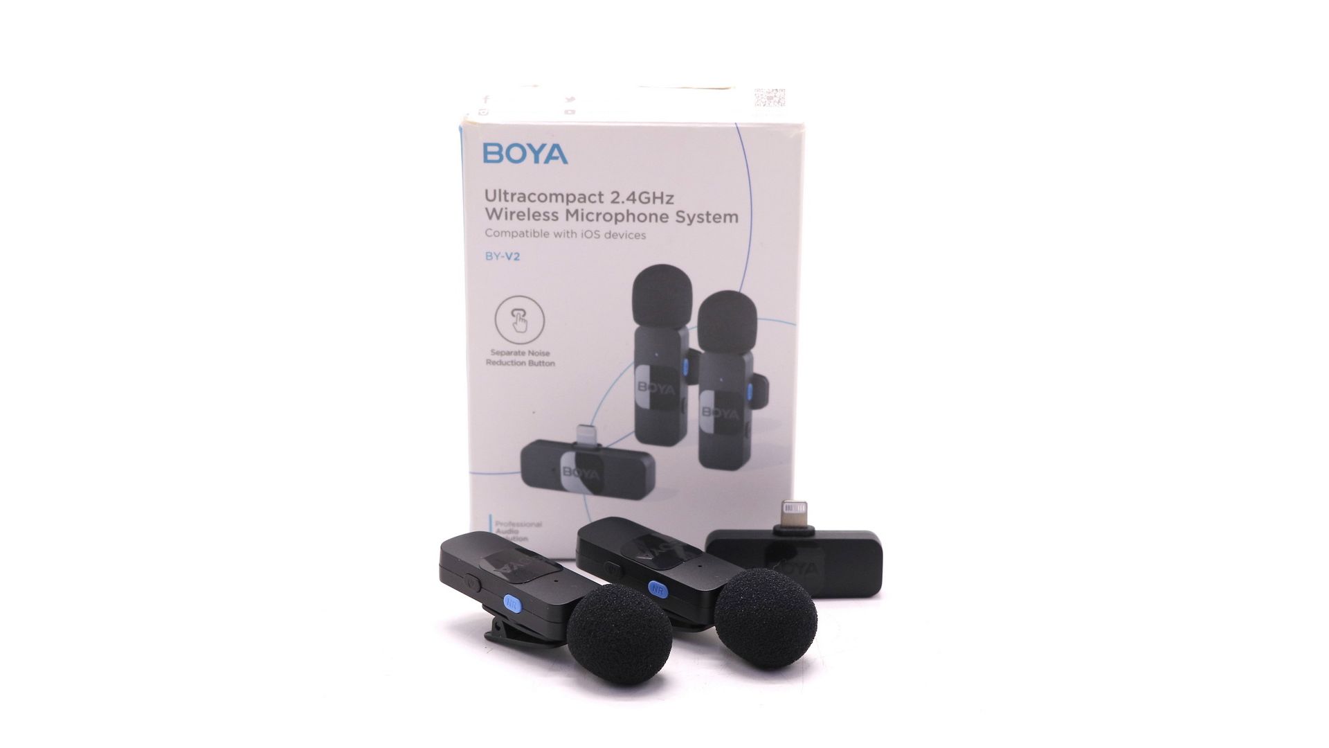Boya BY-V2 — беспроводной петличный микрофон с двумя передатчиками и одним приёмником, созданный для качественной записи звука на устройства Apple с разъёмом Lightning.