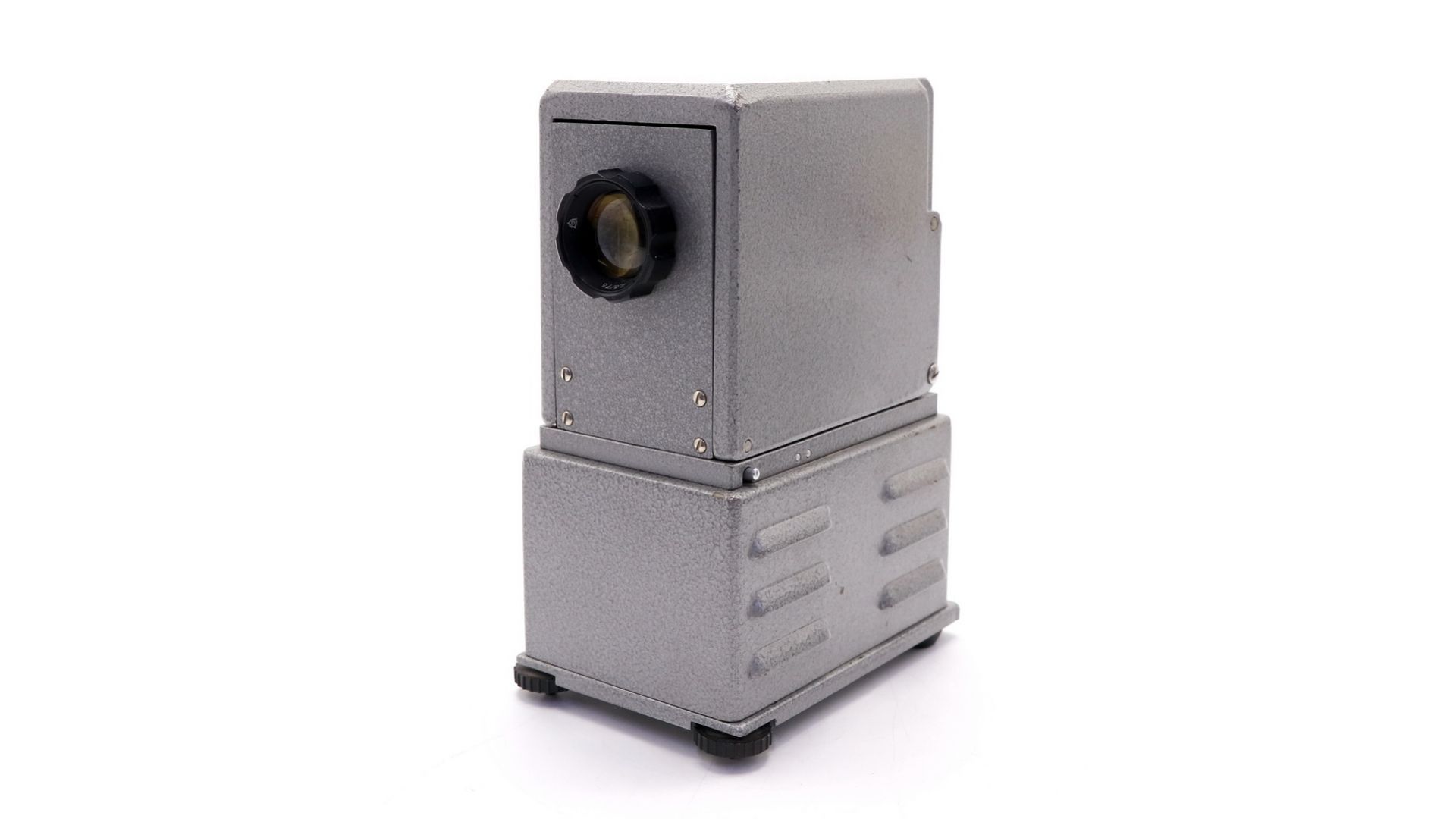 Диапроектор с трансформатором на 12в. Используется для просмотра слайдов и диафильмов. Так же позволяет просматривать фото-негативы и позитивную фотоплёнку. На рамке под плёнку имеется прижимной винт, который служит для её надёжного крепления на корпусе. Оптическая схема диапроектора состоит из 3-х линзового конденсора с теплофильтром и объектива Триплет. В качестве источника света используется кинопроекционная лампа К12-90. Изображение яркое и чёткое по всей площади.