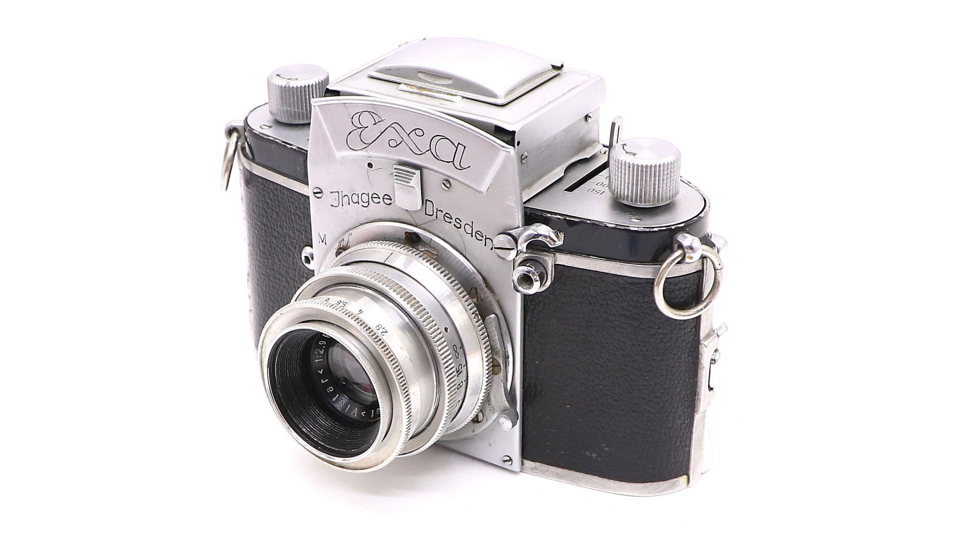 Отличается превосходным качеством сборки и стильным дизайном. Данный экземпляр создавался по концепции «второго фотоаппарата» — как резервный аппарат с урезанными характеристиками, который можно было зарядить пленкой более высокой чувствительности. Диапазон выдержек: В, 25, 50, 100, 150. Видоискатель шахтного типа, поле зрения видоискателя: 95%. Экземпляр оснащен объективом Victar Anastigmat 2,9/50. Exa Jhagee Dresden - станет достойным экземпляром в коллекции, а также подойдет для фотоэкспериментов.