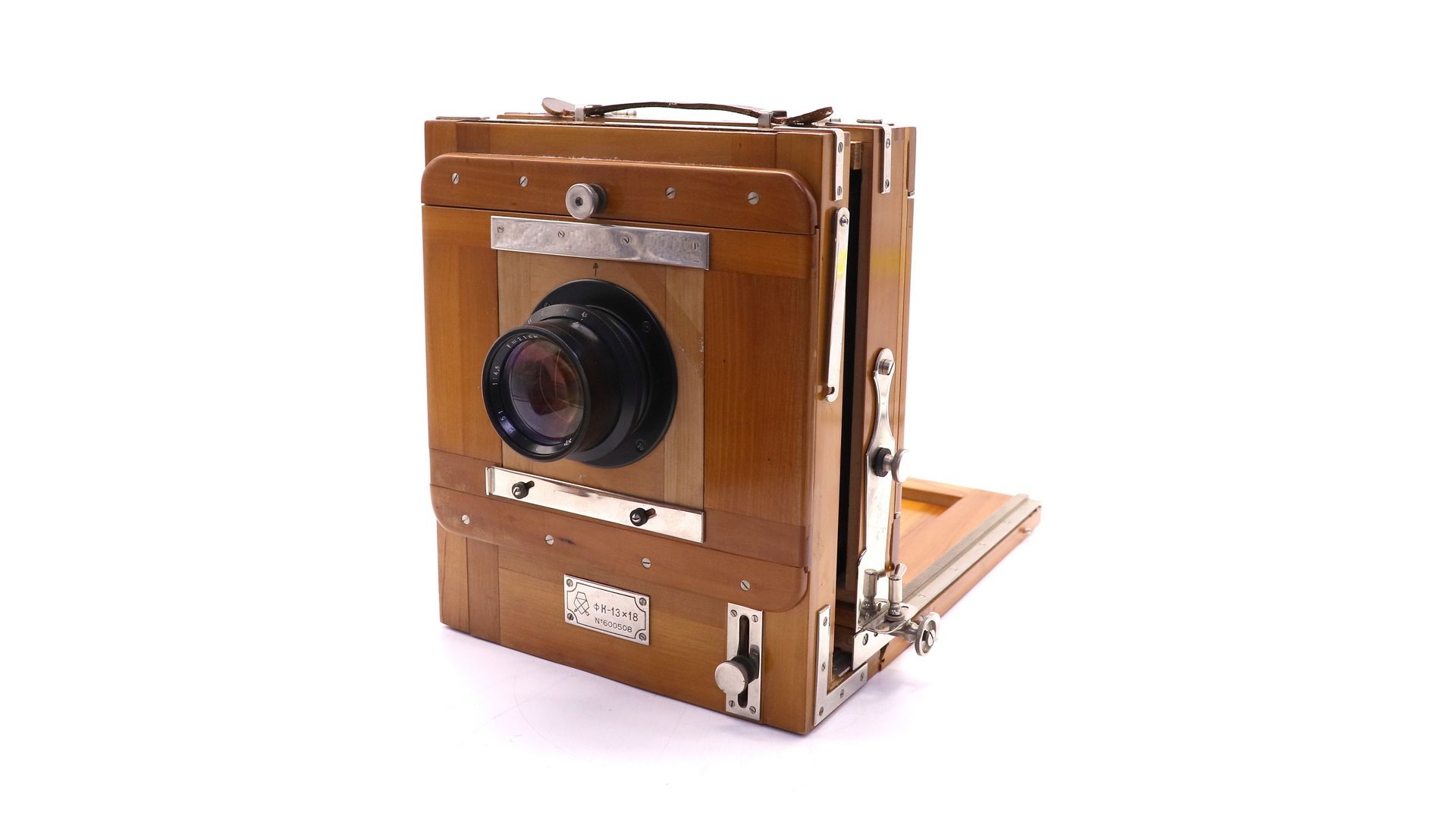 ФК 13×18 с объективом Индустар-51 — классическая форматная камера с кадром 13×18 см и квадратным мехом двойного растяжения. Корпус складной, выполнен из красного дерева, что придаёт устройству эстетичный и винтажный вид. Точная фокусировка осуществляется передвижением задней рамки с матовым стеклом посредством кремальеры. Объективная доска снабжена горизонтальными и вертикальными подвижками для точной композиции и коррекции перспективы. Объектив Индустар-51 обеспечивает высокую резкость. Экспозиция производится вручную — открытием крышки объектива. Отличный выбор для художественной и студийной съёмки.