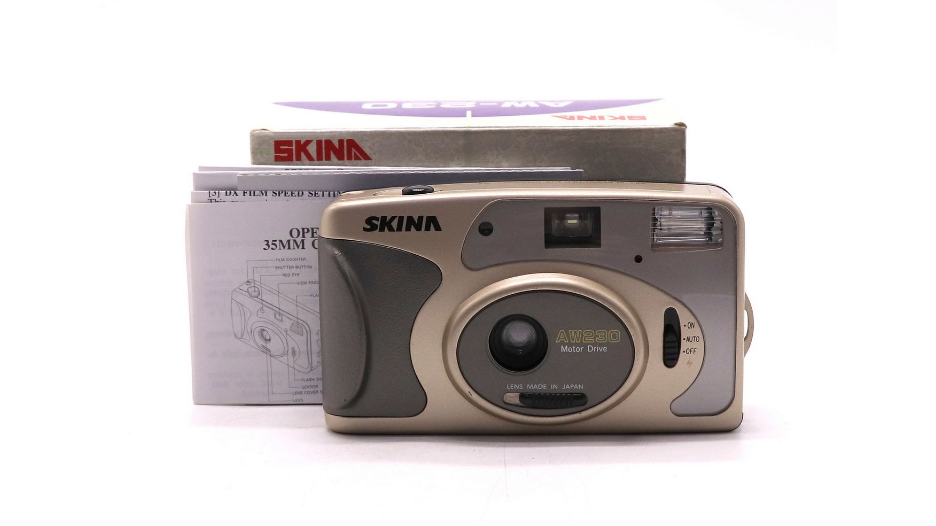 Компактный плёночный фотоаппарат Skina AW‑230 — простой и надёжный инструмент для любителей аналоговой съёмки. Оснащён объективом 35 мм / f5,6 с фокусировкой от 1,6 м до бесконечности. Имеет встроенную вспышку с режимами «Авто», «Включена» и «Отключена», а также защиту от эффекта «красных глаз». Работает на двух батарейках типа АА. Поддерживает плёнку 35 мм с диапазоном ISO 100–400. Отличается автоматической перемоткой плёнки и фиксированной выдержкой 1/125 с. Удобный корпус и минималистичное управление делают его отличным выбором для начинающих.