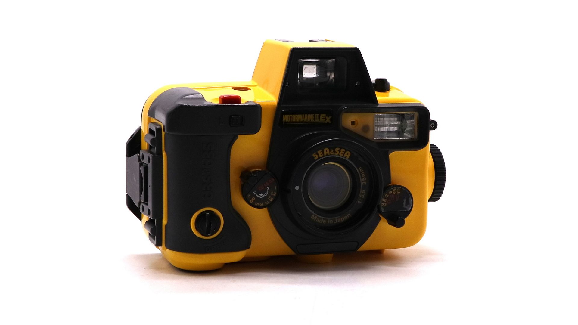 MOTOR MARINE II EX имеет широкоугольный объектив с фокусным расстоянием 20 мм F3.8, обладает увеличенной глубиной резкости и позволяет делать макросъемку с расстояния 23 см (при F22). Угол обзора объектива под водой равен 77 градусам, это позволит делать великолепные панорамы. Световой целеуказатель обеспечивает точное кадрирование в условиях недостаточной видимости. Диапазон выдержек (15, 30, 60, 125, 250) и диафрагм (3, 8, 5, 6, 8, 11, 16, 22) достаточен для съемок любых подводных сюжетов. На задней крышке расположен регулятор, который позволяет плавно варьировать энергию подключенной вспышки. Удобное управление фокусировкой — всего два положения переключателя 0,4—1 м и 0,7 м – бесконечность. Усиленный корпус позволяет погружаться на глубины до 60 метров.