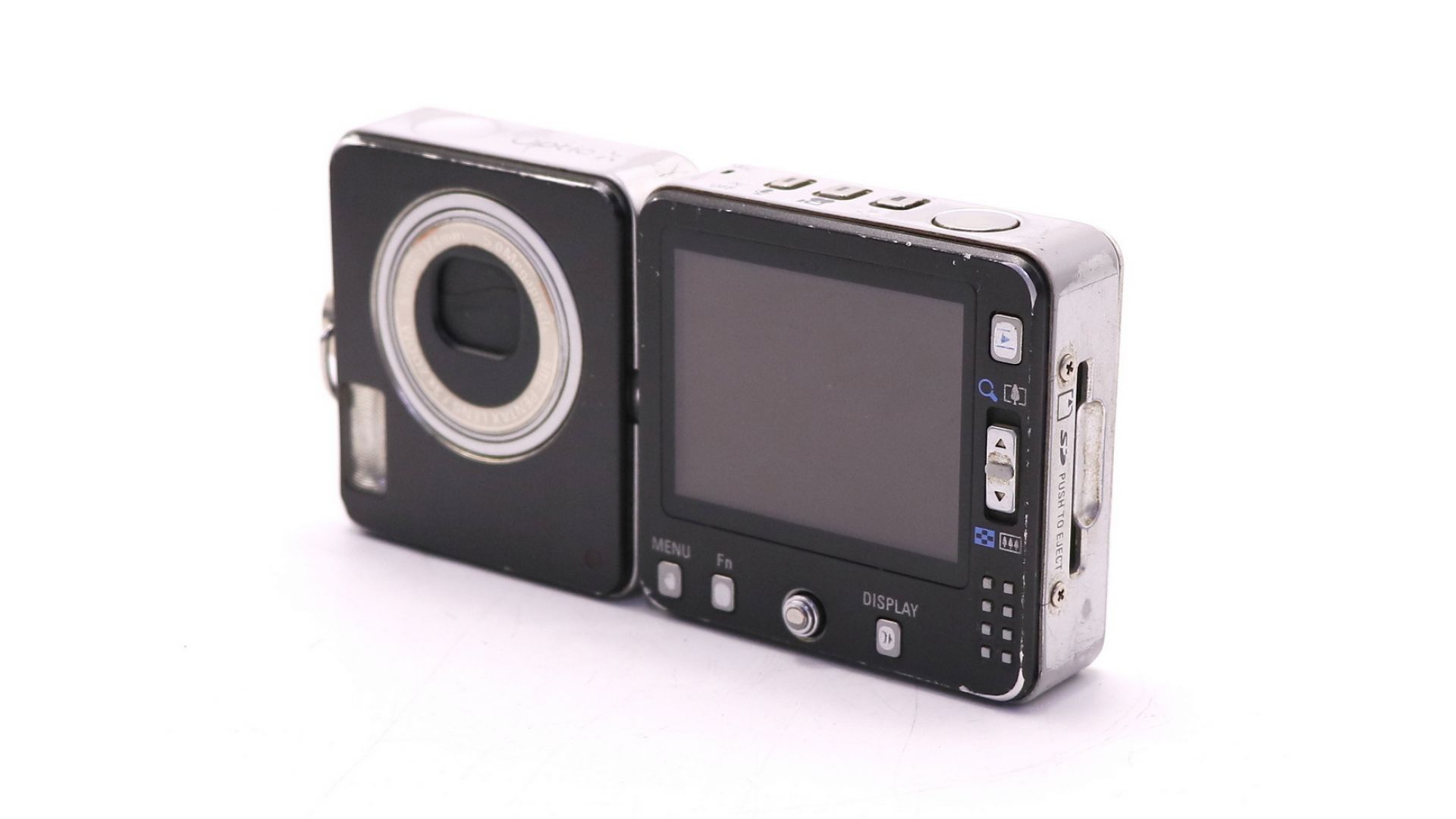 Культовая камера с поворотным корпусом и нестандартной компоновкой — объектив расположен в верхней части, что позволяет снимать под необычными углами. При толщине всего 18 мм остается полнофункциональным фотоаппаратом.