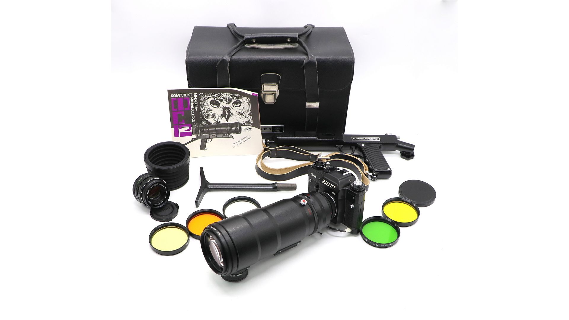 Комплектация:Кофр, Зенит 12xps, объектив Гелиос-44М-4 2/58, объектив TAIR-3S 4,5/300, светофильтры, приклад, бленда.
