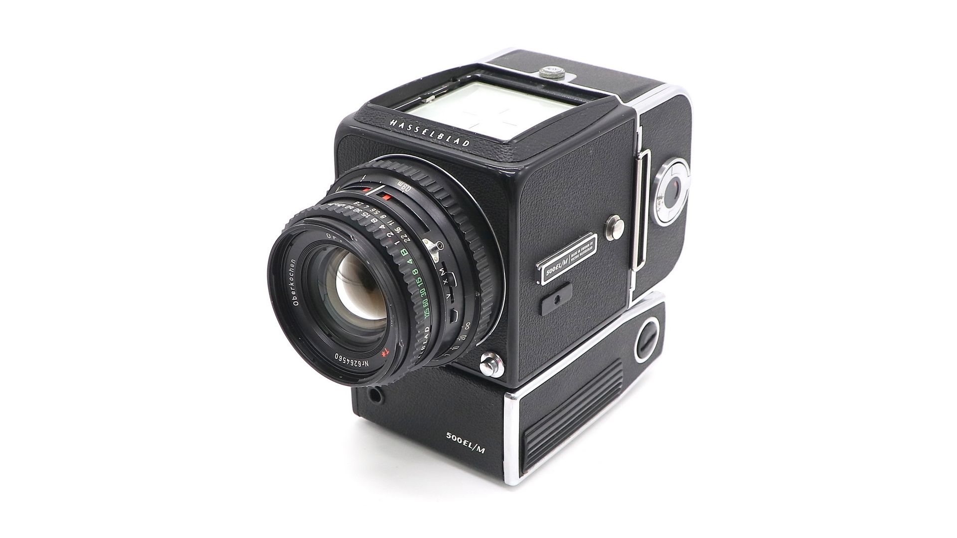 Камера оснащена сменным фокусирующим экраном, включая призматический видоискатель со встроенным экспонометром. Экземпляр оснащен объективом Oberkochen Opton PL 2.8/80mm с антибликовым покрытием и внутренней светопоглощающей обработкой, оптика обеспечивает непревзойденные контрастность и цветовую насыщенность — превосходное качество. Hasselblad 500 EL/M идеален для широкого спектра фотографических ситуаций и легко адаптируется в соответствии с меняющимися требованиями — он одинаково хорош и в студии, и на выезде.