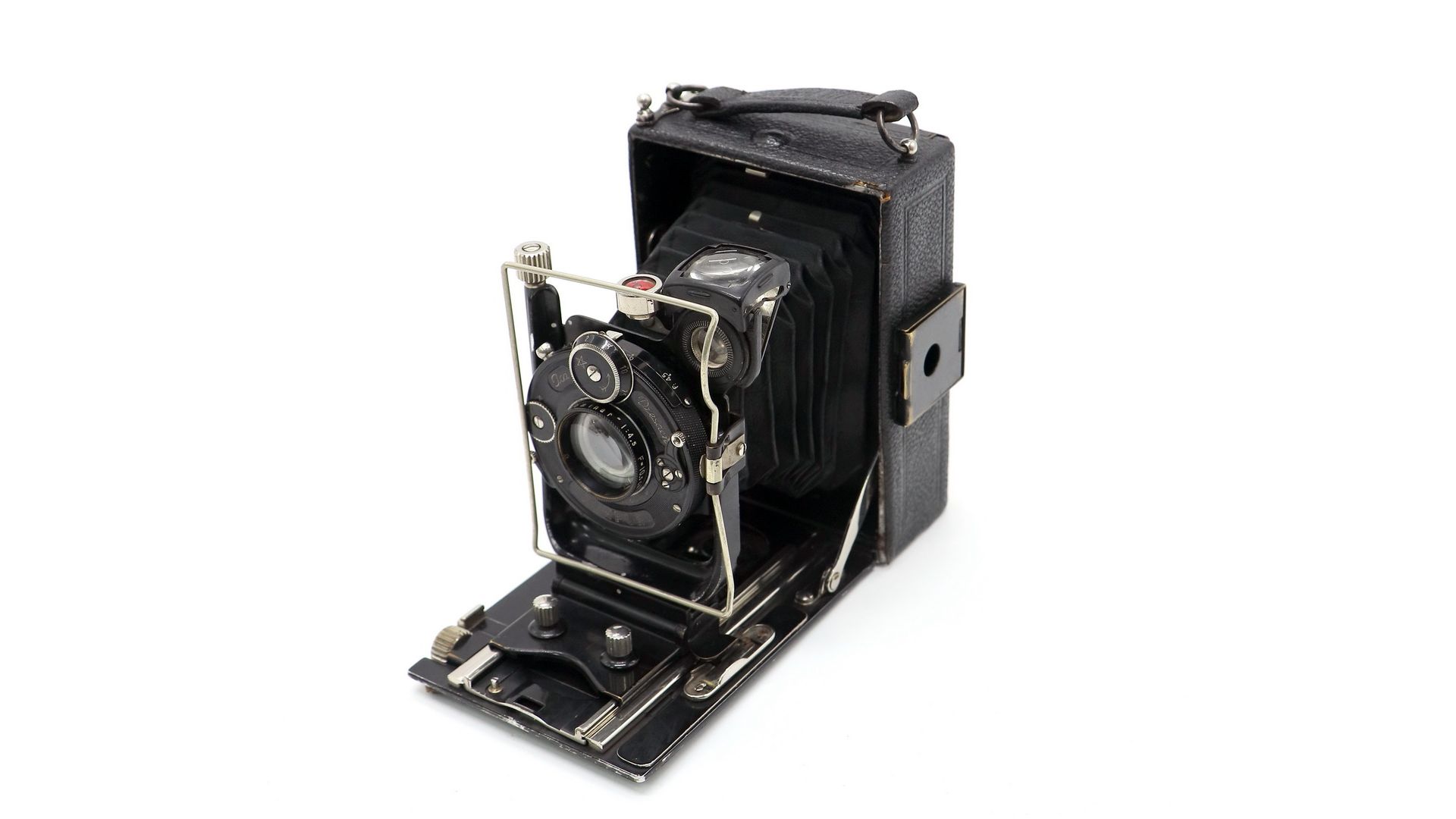 Экземпляр оснащен объективом Dominar 105mm f/4.5. Диапазон выдержек: Т, В, 1 - 1/200 с. Камера имеет двойное расстяжение меха, которое позволяет устанавливать оптику до 360 мм, а также осуществлять макросъемку. Передняя объективная стойка имеет вертикальный и горизонтальный шифт.