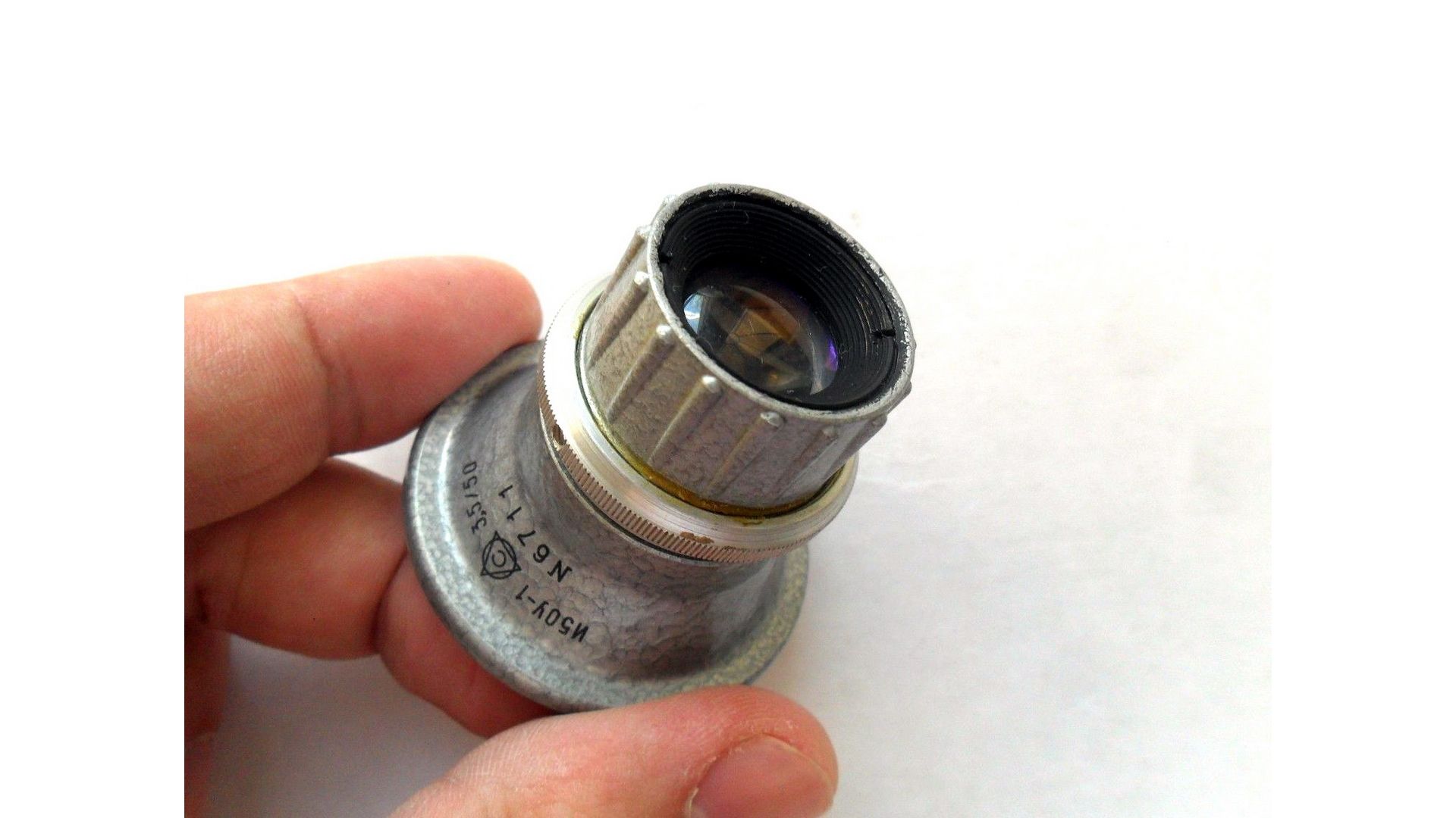 Данный экземпляр очень компактный, корпус выполнен из металла. Объектив не обладает кольцом фокусировки. Фокусироваться удобно двигая камерой к предмету съемки или от него. Кольцо управления диафрагмой не имеет промежуточных фиксированных значений, вращается плавно, что позволяет установить любое значение числа F (F/3.5 до F/11). Диафрагма оснащена 6-ю лепестками. И50У-1 3,5/50 очень резкий, так как служил для фотоувеличителей и должен был передавать мельчайшие детали. Отлично подходит для макро съемки.