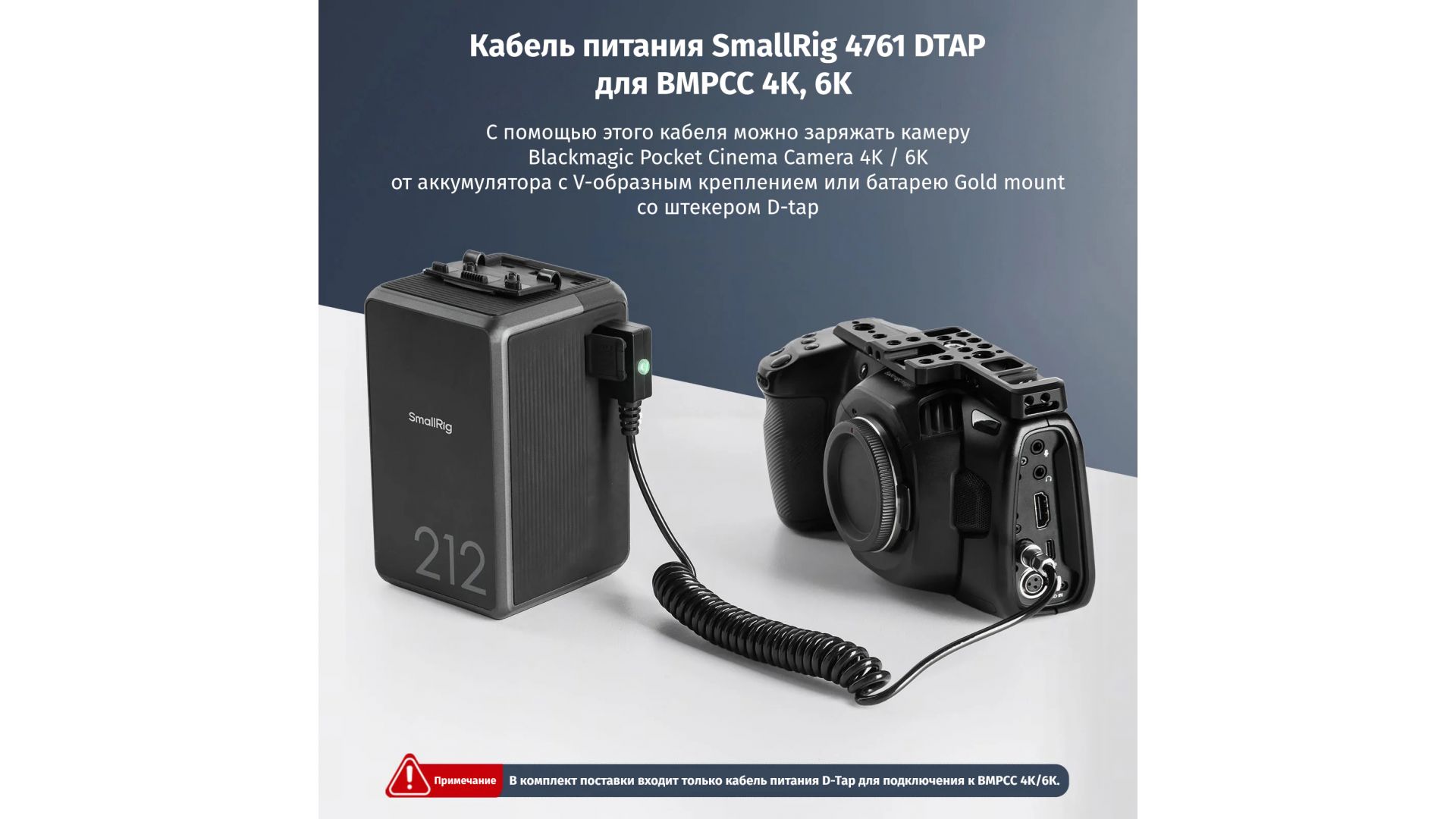 Комплектация:Кабель питания SmallRig 4761 (D-TAP – BMPCC 4K/6K).