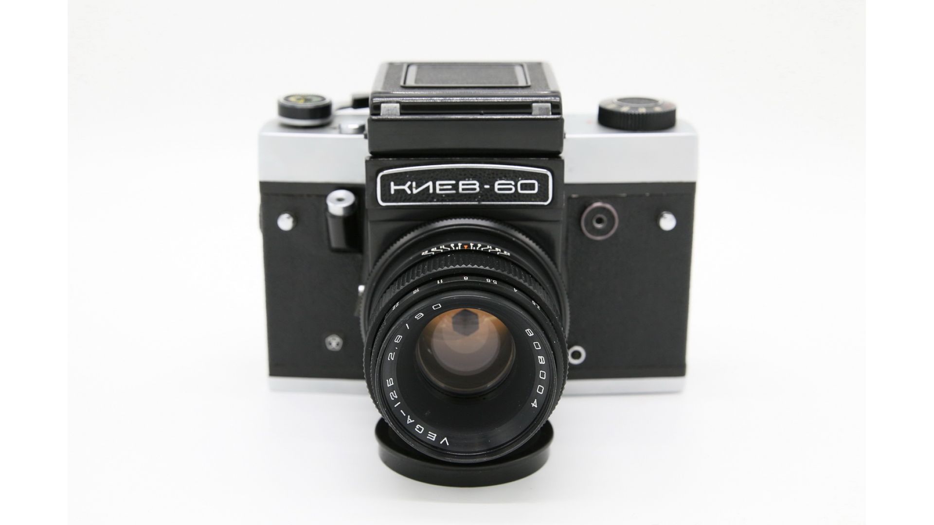 Корпус литой из алюминиевого сплава, задняя стенка откидывающаяся на петлях. Курковый взвод затвора и перемотки плёнки. Затвор шторный, фокальный, с диапазоном выдержек от 1/2 до 1/1000 с и «В». Фотоматериал плёнка типа 120, размер кадра 6×6 см. Данный экземпляр оснащен объективом Вега-12Б. Киев-60 - вполне соответствовавшая требованиям своего времени камера, гораздо более современная, чем другие отечественные модели среднеформатрных камер, имеет сложную механику, модульную конструкцию и сменную оптику. Такой аппарат прослужит вам долгие годы!