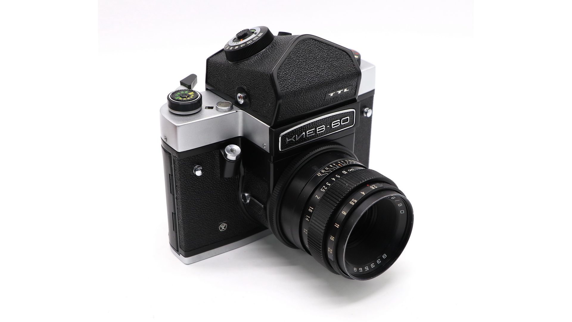 Корпус литой из алюминиевого сплава, задняя стенка откидывающаяся на петлях. Курковый взвод затвора и перемотки плёнки. Затвор шторный, фокальный, с диапазоном выдержек от 1/2 до 1/1000 с и «В». Фотоматериал плёнка типа 120, размер кадра 6×6 см. Данный экземпляр оснащен объективом Вега-12Б. Киев-60 - вполне соответствовавшая требованиям своего времени камера, гораздо более современная, чем другие отечественные модели среднеформатрных камер, имеет сложную механику, модульную конструкцию и сменную оптику. Такой аппарат прослужит вам долгие годы!