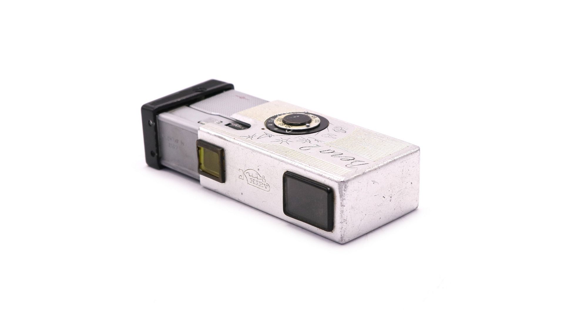 Затвор шторный, с горизонтальным движением металлических шторок. Расположен перед объективом. Затвор имеет постоянную щель, длительность выдержки регулируется изменением скорости движения шторок. Возможна отработка только трёх выдержек — 1/30, 1/60 и 1/200 секунды. Диафрагма двухлепестковая, с квадратным отверстием диафрагмы. Управление — кольцом, выведенным на боковую стенку камеры. На внешнем кожухе находится калькулятор — табличный экспонометр для приблизительного определения выдержки и диафрагмы по погодным условиям. Фотоматериал - неперфорированная и перфорированная 16-мм фотокиноплёнка. Размер кадра - 10×14 мм.