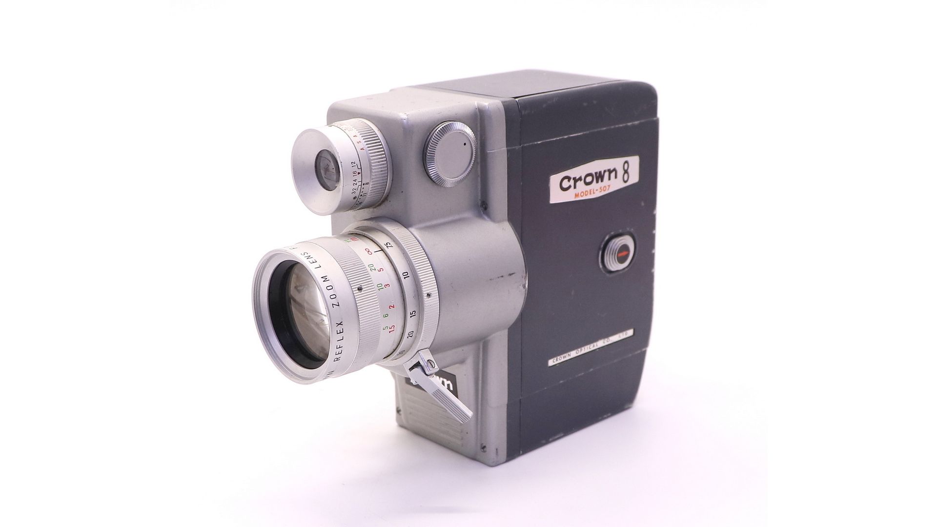 Кинокамера с ручной фокусировкой Super 8 мм, представленная Crown в 1960-х годах. Металлический корпус с приглушенной синей и серебристо-серой отделкой.