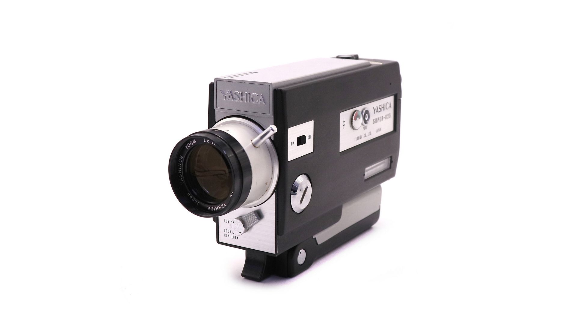 Кинокамера Yashica Super-825 неисправная производилась компанией Yashica Company Limited. Имеет серебристый корпус с чёрной полосой и чёрную ручку.