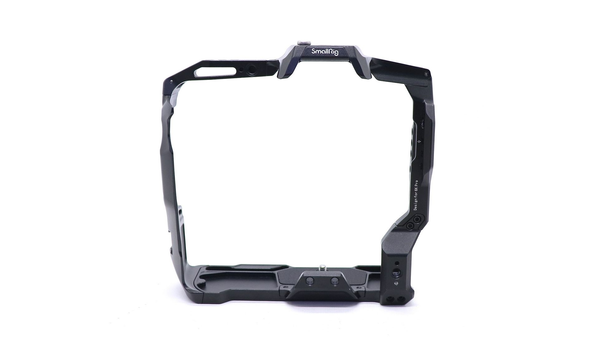 Камера крепится к клетке с помощью одного винта 1/4 "-20 сверху и двух винтов 1/4" -20 снизу, работающих вместе, чтобы предотвратить скручивание камеры. Для установки аксессуаров в клетке есть многочисленные резьбы для крепления аксессуаров и штатива 1/4 "-20 и 3/8" -16, крепление для башмака и левая рейка НАТО для шарнирного соединения рук, рукояток, монитора, фонарика, микрофона и других аксессуаров. Есть также прорези для ремешка, чтобы добавить отдельно доступный ремешок для запястья или шеи.