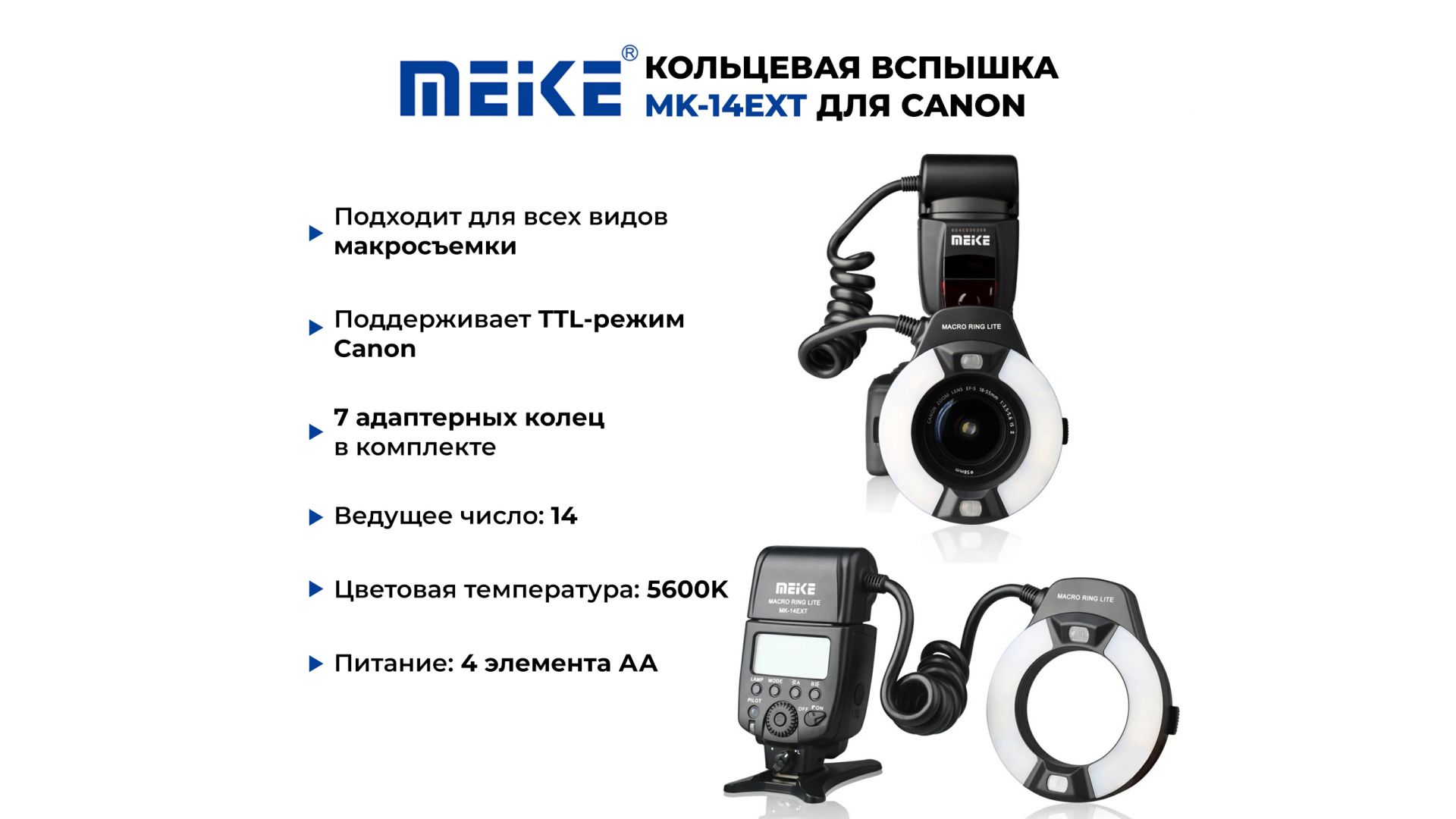 Кольцевая TTL макро-вспышка Meike MK-14EXT идеально подходит для всех видов макросъемки: стоматологической, медицинской, криминалистической, научной и хобби съемок. Вспышка Meike MK 14EXT Canon поддерживает автоматический TTL режим Canon, режим ручной настройки мощности М и режим стробоскома Multi. Кольцевой осветительный блок вспышки состоит из двух сегментов. Для каждого из сегментов можно отдельно устанавливать индивидуальную мощность.