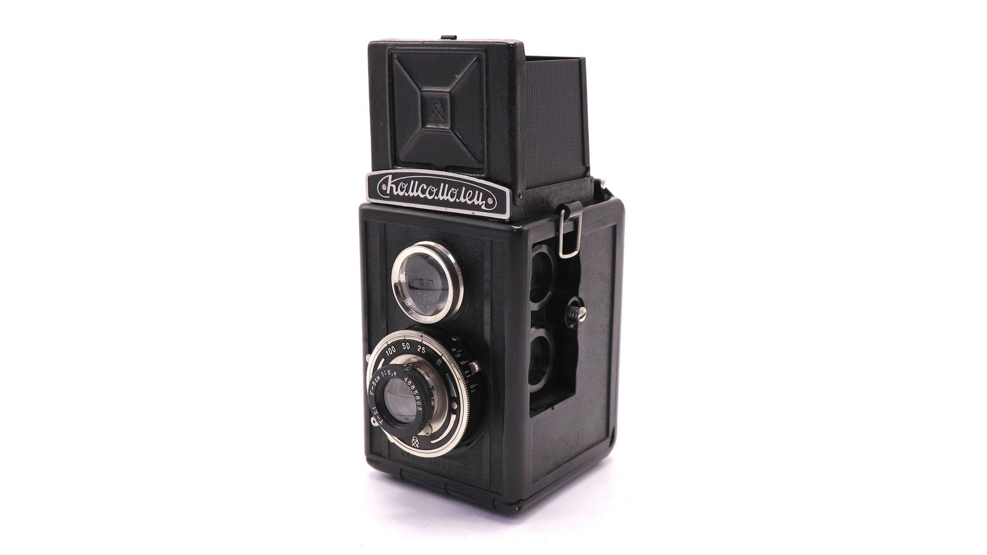 Экземпляр оснащен я объективом «Т-21» f 6,3/80 мм. Система наводки камеры на резкость — по шкале расстояний. Пределы фокусировки — от 1,5 м до бесконечности. Затвор камеры — центральный, межлинзовый, с предварительным взводом и выдержками 1/25, 1/50 и 1/100 секунды, а также «B» (затвор открыт при нажатой кнопке спуска). Диапазон диафрагм — от 6,3 до 16 (маркированы значения 6,3, 8, 11 и 16), система диафрагмирования — ирисовая. Фотоматериал фотоплёнка типа 120 с форматом кадра 6×6 см (по 12 кадров на плёнке).