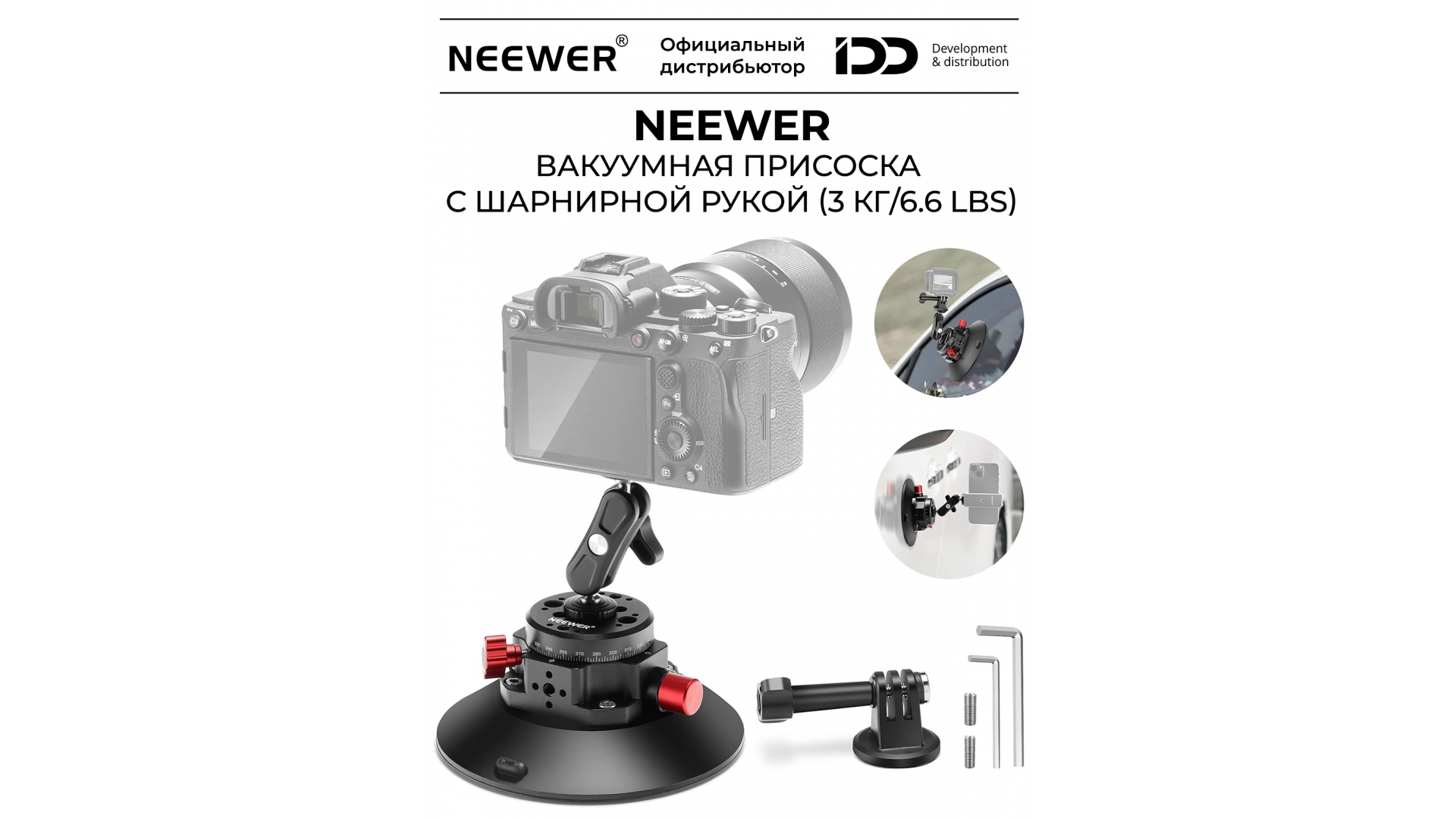 Комплектация:Вакуумная присоска NEEWER CA013 с креплением Magic Arm, рукоятка, шестигранных ключа L-образной формы - 2 шт., адаптер 1/4, Адаптер 3/8