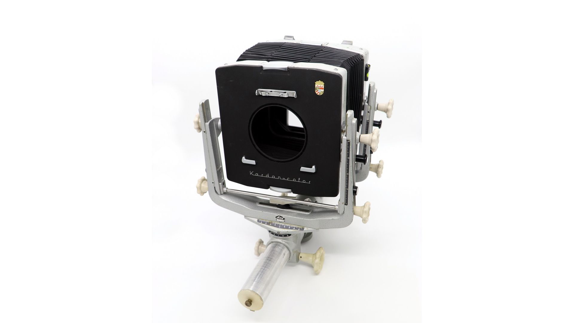 Камера базируется на монорельсе с прямыми перемещениями и предназначена для работы с листовой пленкой форматом 4×5“. Она позволяет осуществлять все основные настройки: большие прямые смещения, боковые и вертикальные смещения переднего и заднего стандартов, вертикальные и горизонтальные наклоны. Камера годится, как для студийной, так и для выездной фотосъемки: быстро собирается и разбирается, в разобранном, походном виде занимает мало места.