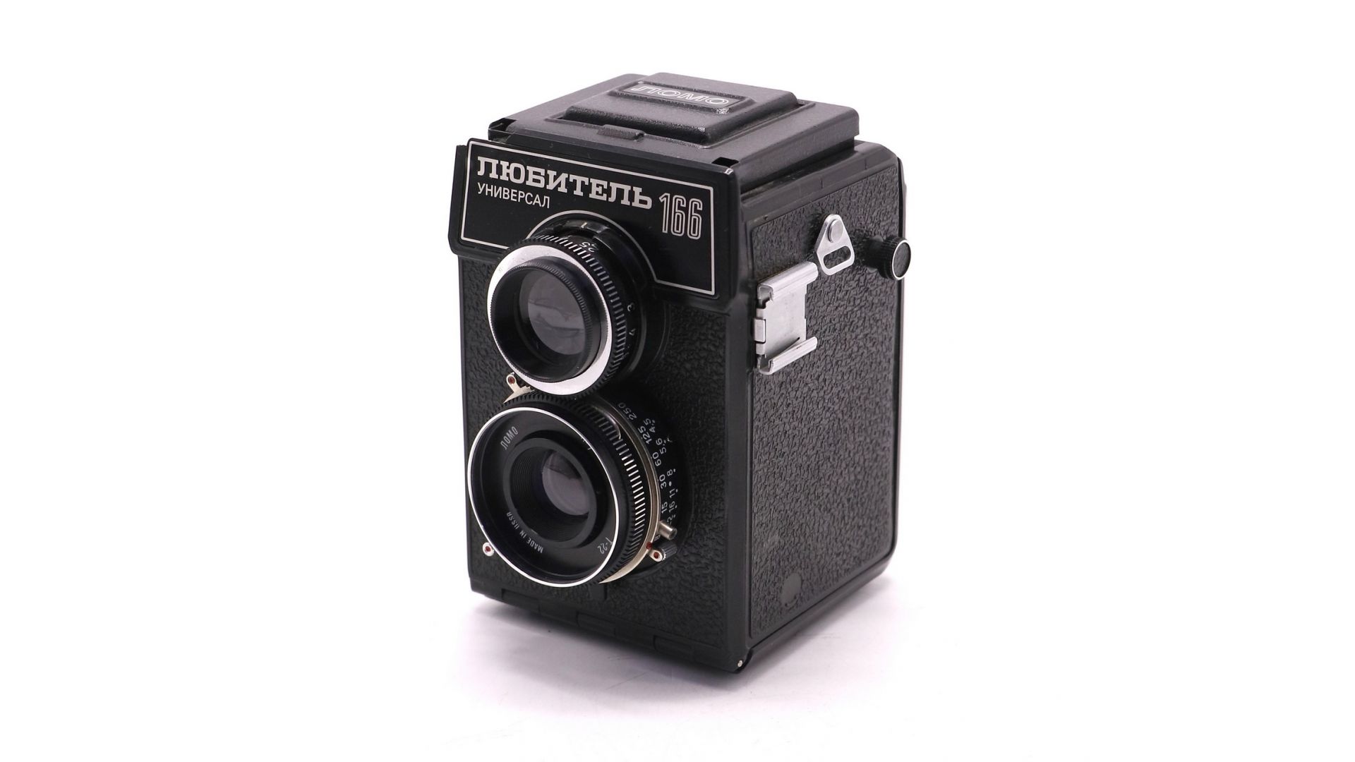 Двухобъективный зеркальный фотоаппарат (ТЛР) для съёмки на плёнку типа 120. Ключевая особенность – сменные адаптеры, позволяющие получать кадры трёх форматов: 12 классических квадратных (6×6 см), 16 широких (4,5×6 см) или 12 панорамных кадров (6×12 см). Оснащён объективом «Индустар-66» 75mm f/3.5, обеспечивающим характерное мягкое изображение с узнаваемым винтажным рисунком. Имеет встроенный экспонометр и механический затвор. «Любитель 166» – это доступный путь к экспериментированию с форматами и погружению в атмосферу плёночной фотографии. Ценится за простоту, надежность и уникальный творческий потенциал.