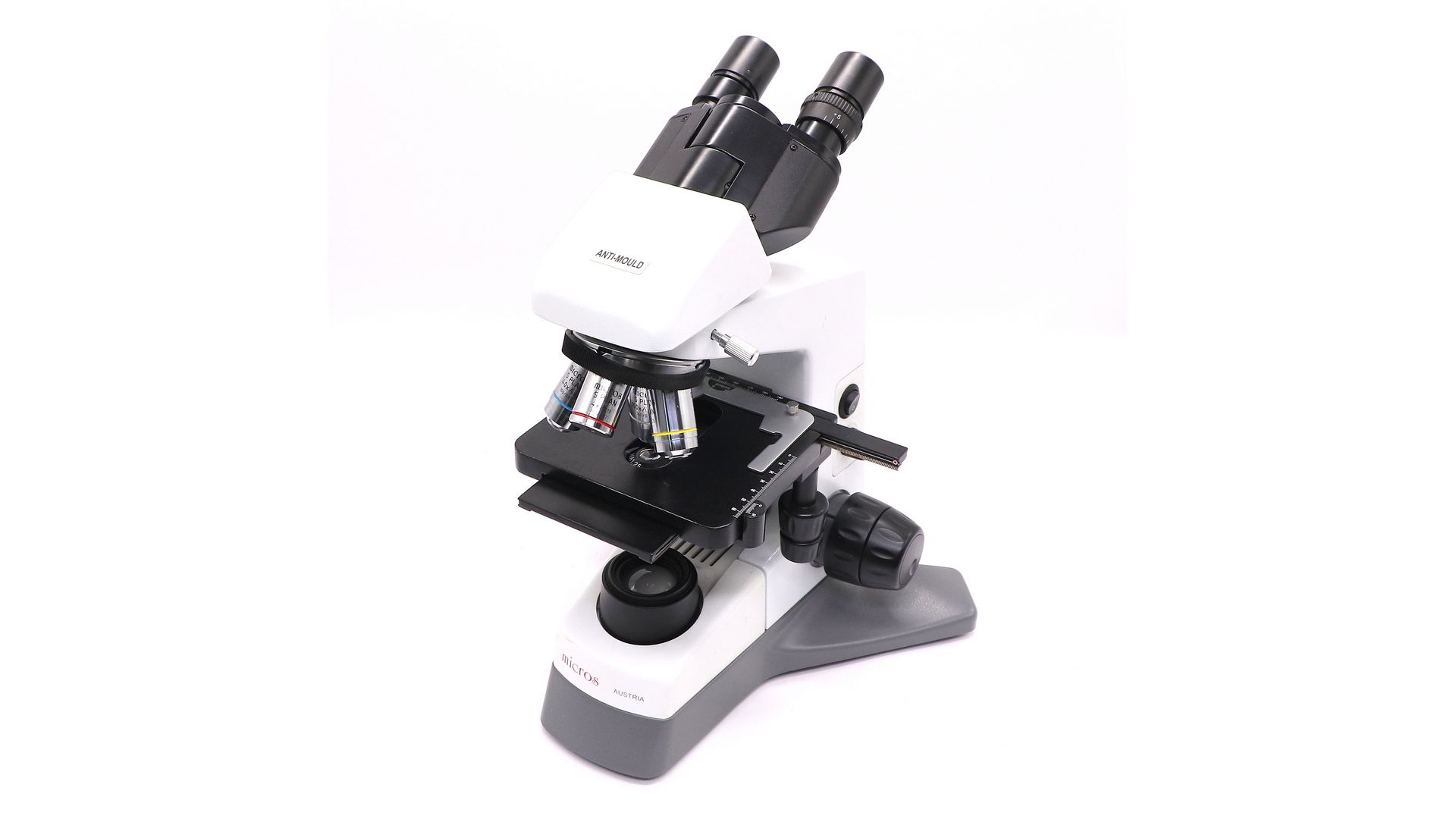 Бинокулярная визуальная насадка микроскопа может поворачиваться на 360°, а окулярные тубусы наклонены на 30°. Для обеспечения максимального комфорта во время продолжительной работы вы можете настроить под себя межзрачковое расстояние и скорректировать диоптрии. Микроскоп оборудован турелью на пять объективов. В комплекте поставляются пять планахроматических объективов с пружинящей оправой для защиты микропрепарата.