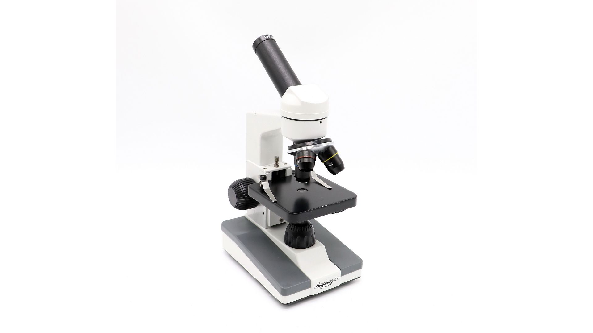 Микроскоп подходит для проведения лабораторных исследований в учебных заведениях и дома. Он обеспечивает увеличение от 80 до 1280 крат благодаря наличию револьверной головки с тремя объективами (4x, 10x и 40x). Светодиодная подсветка способна работать от сети или батареек, что дает широкие возможности для выбора места использования микроскопа. Его получится установить в классе, в палатке, непосредственно у закопушки или на лодке. Визуальная насадка монокулярная, расположена под углом 45º, наиболее удобным для работы.