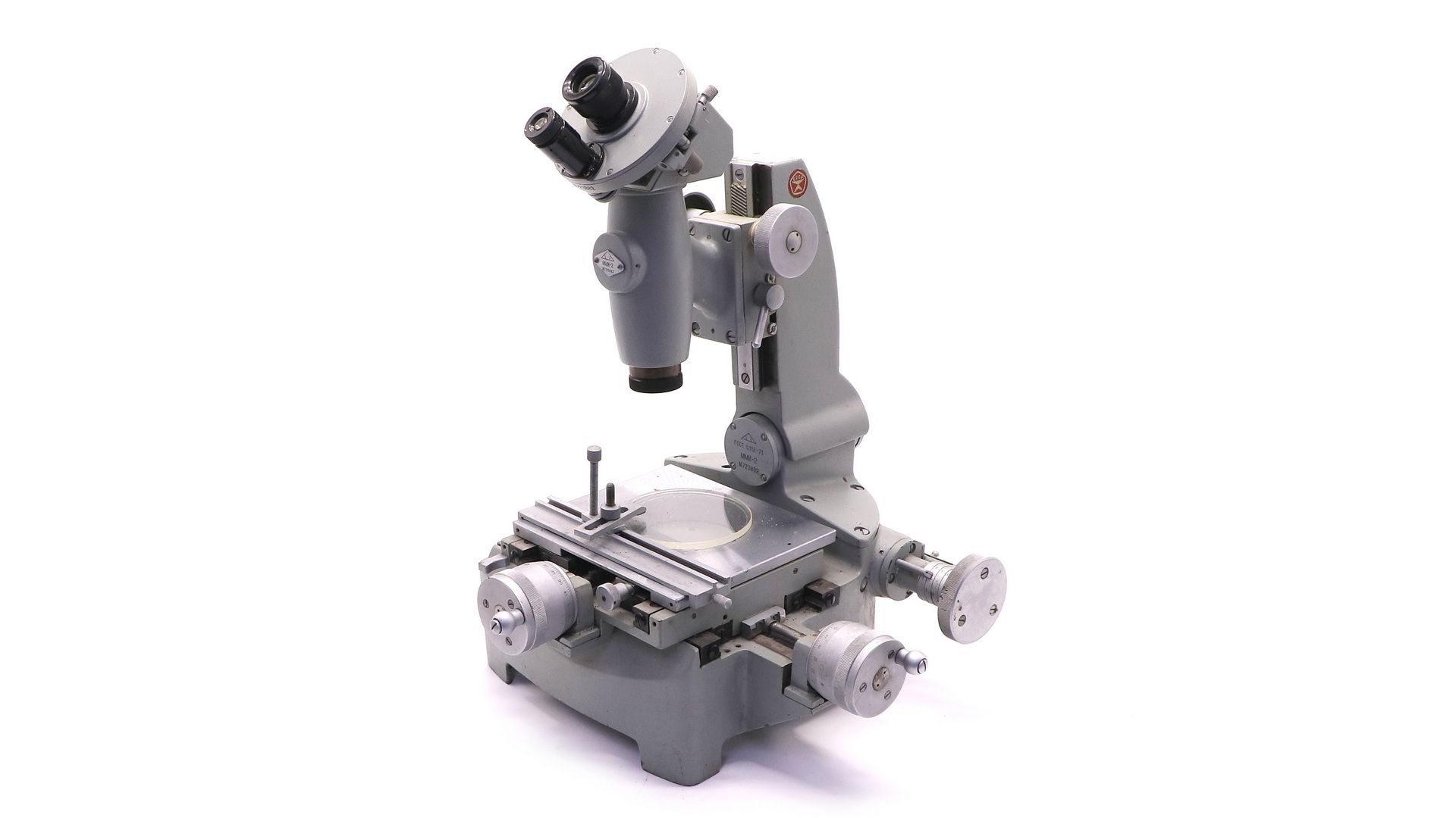 Микроскоп состоит из чугунного основания, на котором смонтирован измерительный стол с микрометрическими винтами продольного и поперечного перемещений и колонка, по направляющим которой при помощи маховичков перемещается кронштейн с микроскопом. В задней стенке основания вмонтировано осветительное устройство.