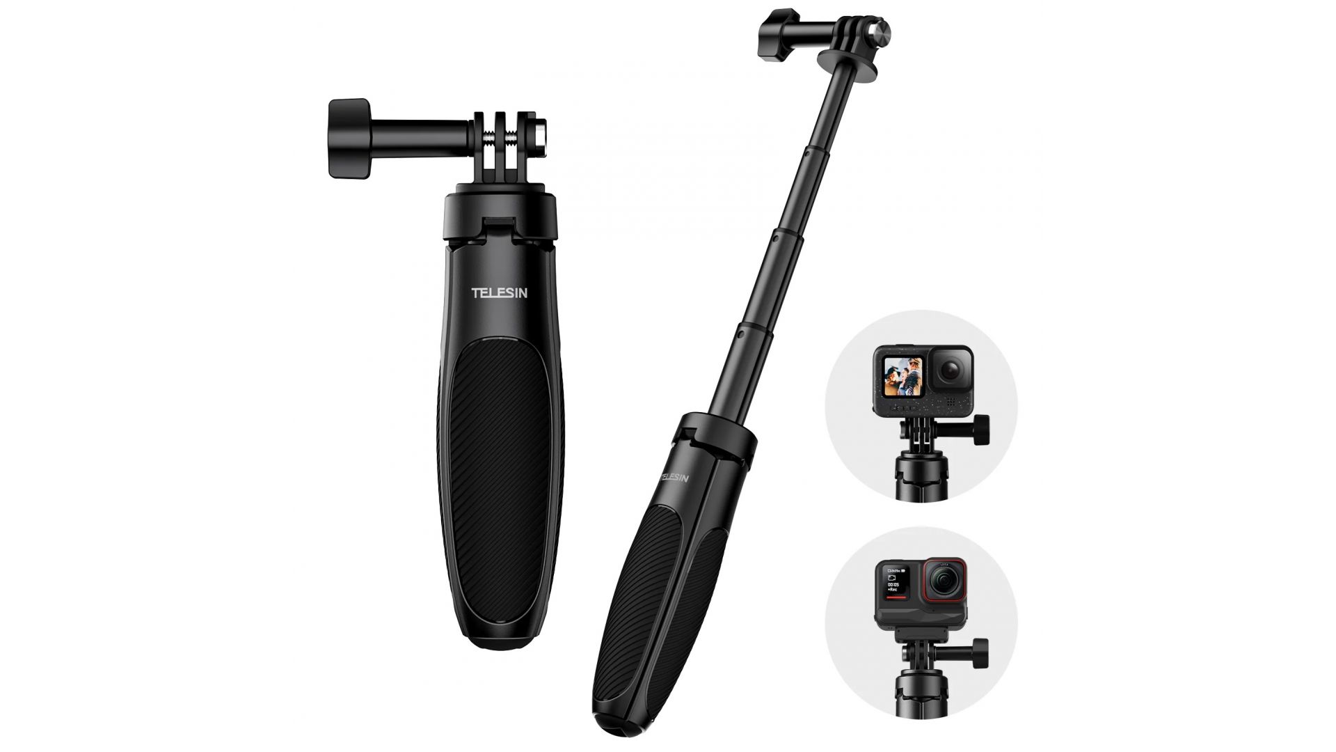 Штатив снащен универсальным креплением для экшн-камер и совместим с большинством моделей, представленных на рынке.