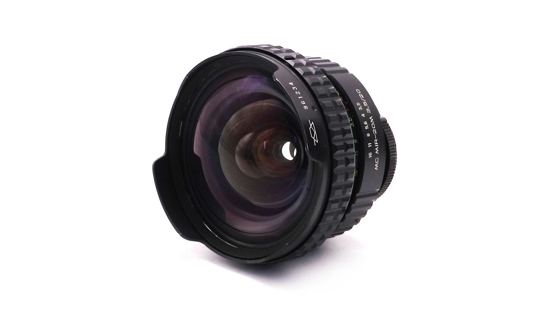 У кольца туговатый и мягкий большой ход — почти 270 градусов! Фокусироваться таким объективом — одно удовольствие! При фокусировке двигается весь линзоблок, но линзы и сама его оправа не вращаются. У данного объектива девять линз в восьми группах, ретрофокусный несимметричный анастигмат типа «Флектогон». В отличие от многих современных объективов, этот — снабжен полноценной шкалой ГРИП, что очень хорошо. На шкале есть все значения стопов диафрагмы. Сама диафрагма у объектива состоит из шести блестящих (без чернения) скругленных лепестков. Мир-20М МС 3.5/20 - мануальный объектив с углом 96 градусов на полный кадр, с неплохой резкостью по центру, хорошим контрастом и коррекцией дисторсии, неплохой эргономикой.