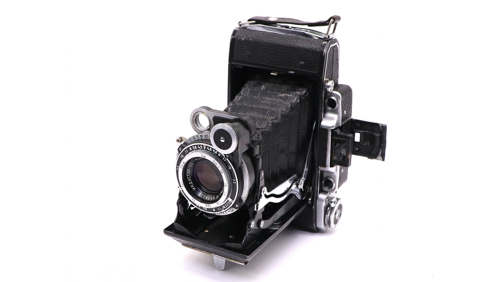 Данный экземпляр оснащен объективом «Индустар-23», фокусное расстояние 110 мм, относительное отверстие 1:4,5, просветление однослойное. Диафрагма ирисовая, значения диафрагм 4,5, 5,6, 8, 11, 16, 22, 32. Затвор центральный, «Момент-23С». Выдержки от 1 с до 1/250 секунды и «В». Синхроконтакт «Х», выдержка синхронизации с фотовспышкой — любая. Видоискатель оптический складной, несопряжённый с дальномером. Наводка на резкость по дальномеру, сопряжённому с вращением передней линзы объектива, фокусировка от «бесконечности» до 1,5 метров. Корпус изготовлен из стального листа и покрыт дерматином. Тип применяемого фотоматериала — плёнка типа 120 (рольфильм). Размер кадра 6×9 или 6×6 см на плёнке типа 120.