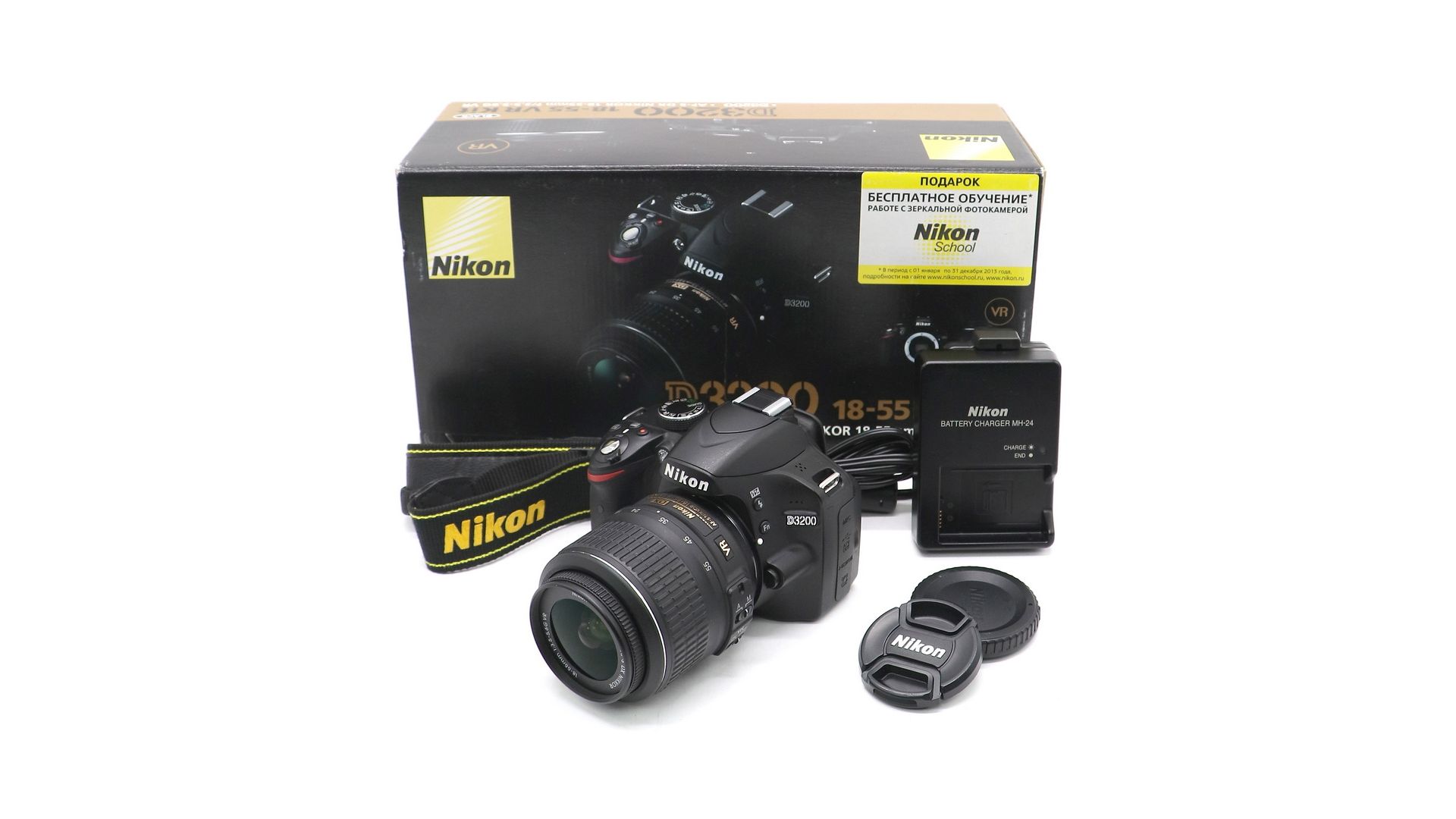 Комплектация:Коробка, зарядное устройство, аккумулятор, объектив Nikon 18-55mm f/3.5-5.6G, документы, крышки, USB-кабель, ремень.