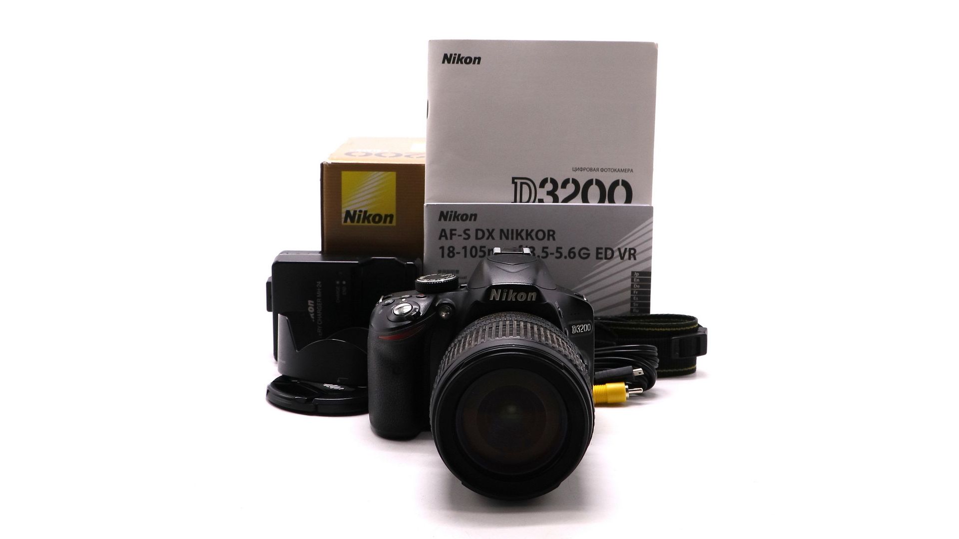 Комплектация:Коробка, документы, объектив AF-S DX Nikkor 18-105mm f/3.5-5.6G ED VR, аккумулятор, зарядное устройство, ремень, крышка, AV-кабель, бленда.