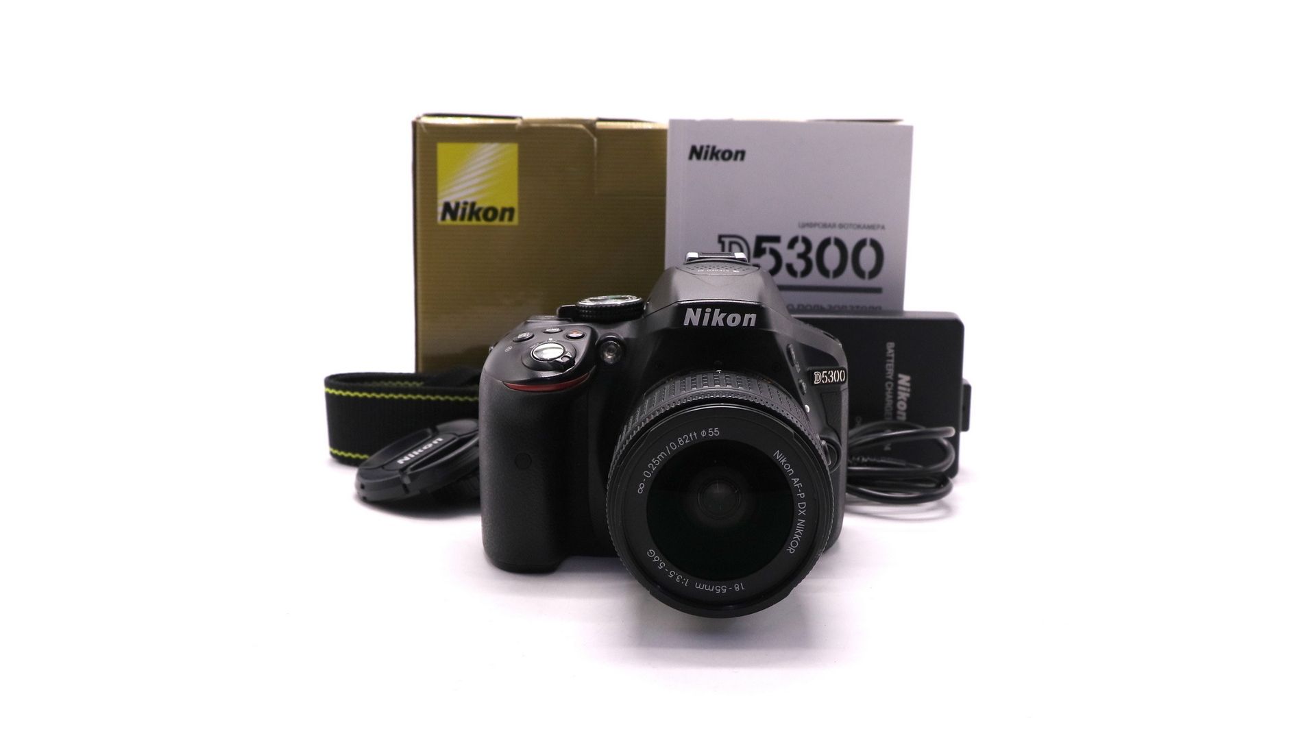 Комплектация:Коробка, документы, ремень, зарядное устройство, крышка байонета, крышки, аккумулятор, объектив Nikon 18-55mm f/3.5-5.6G AF-P VR DX Nikkor, USB-кабель.