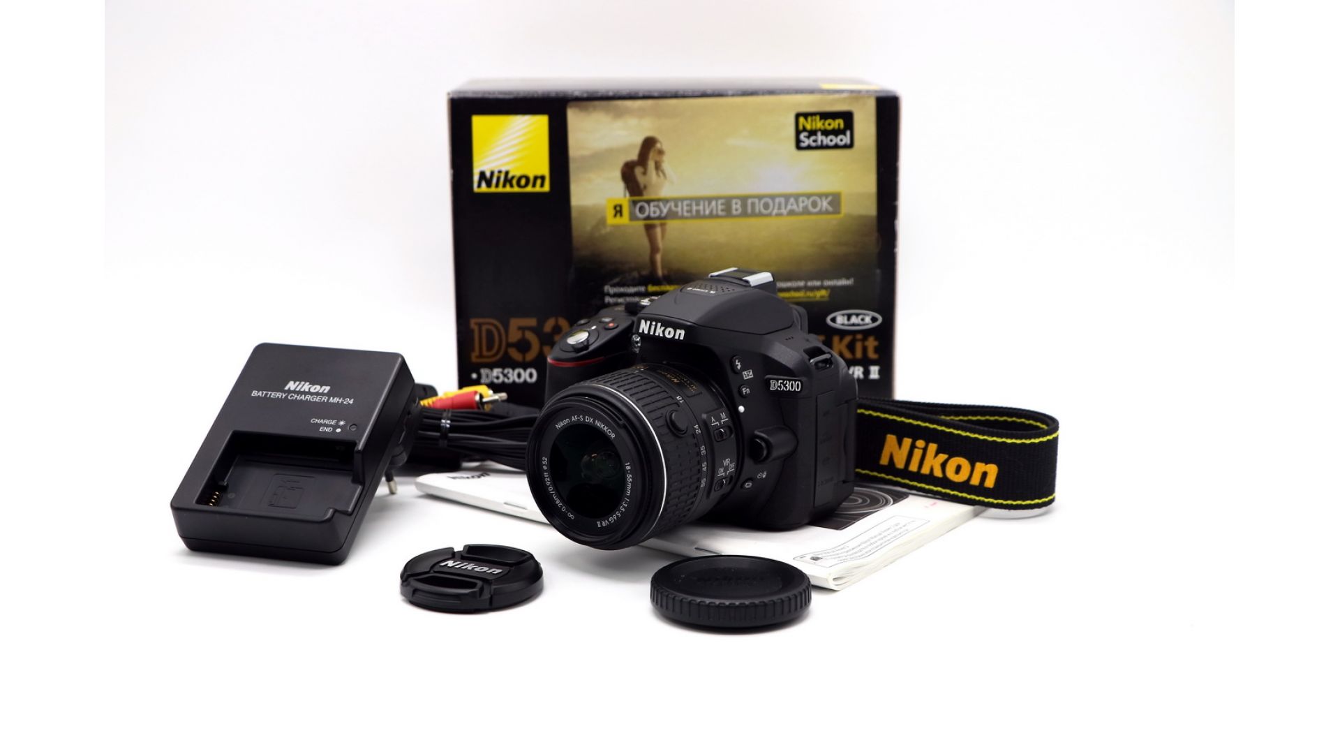 Комплектация:Коробка, документы, аккумулятор, зарядное устройство, крышка байонета, крышки, ремень, объектив Nikon 18-55mm f/3.5-5.6G VR AF-S DX, AV-кабель.