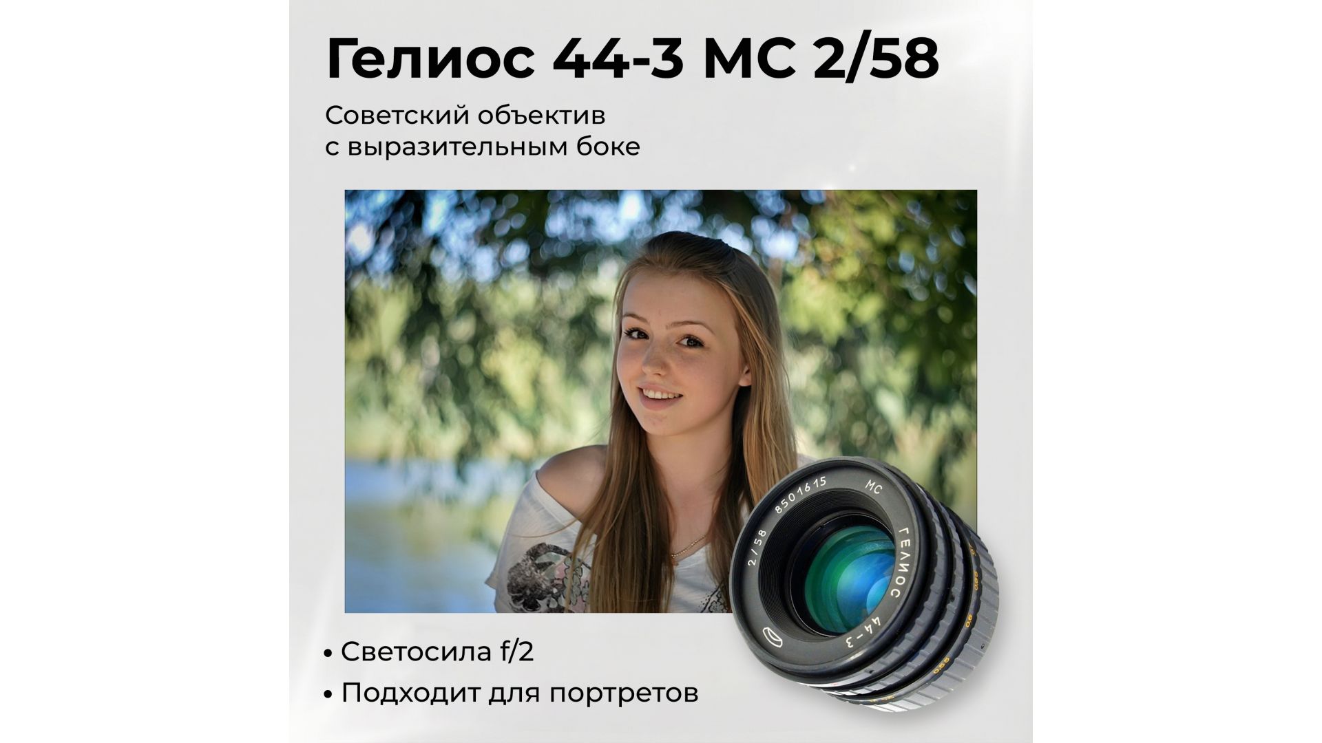 Объектив Гелиос 44-3 МС 2/58 — светосильная советская оптика с плавной фокусировкой и удобным управлением диафрагмой, создающая выразительное закрученное боке.