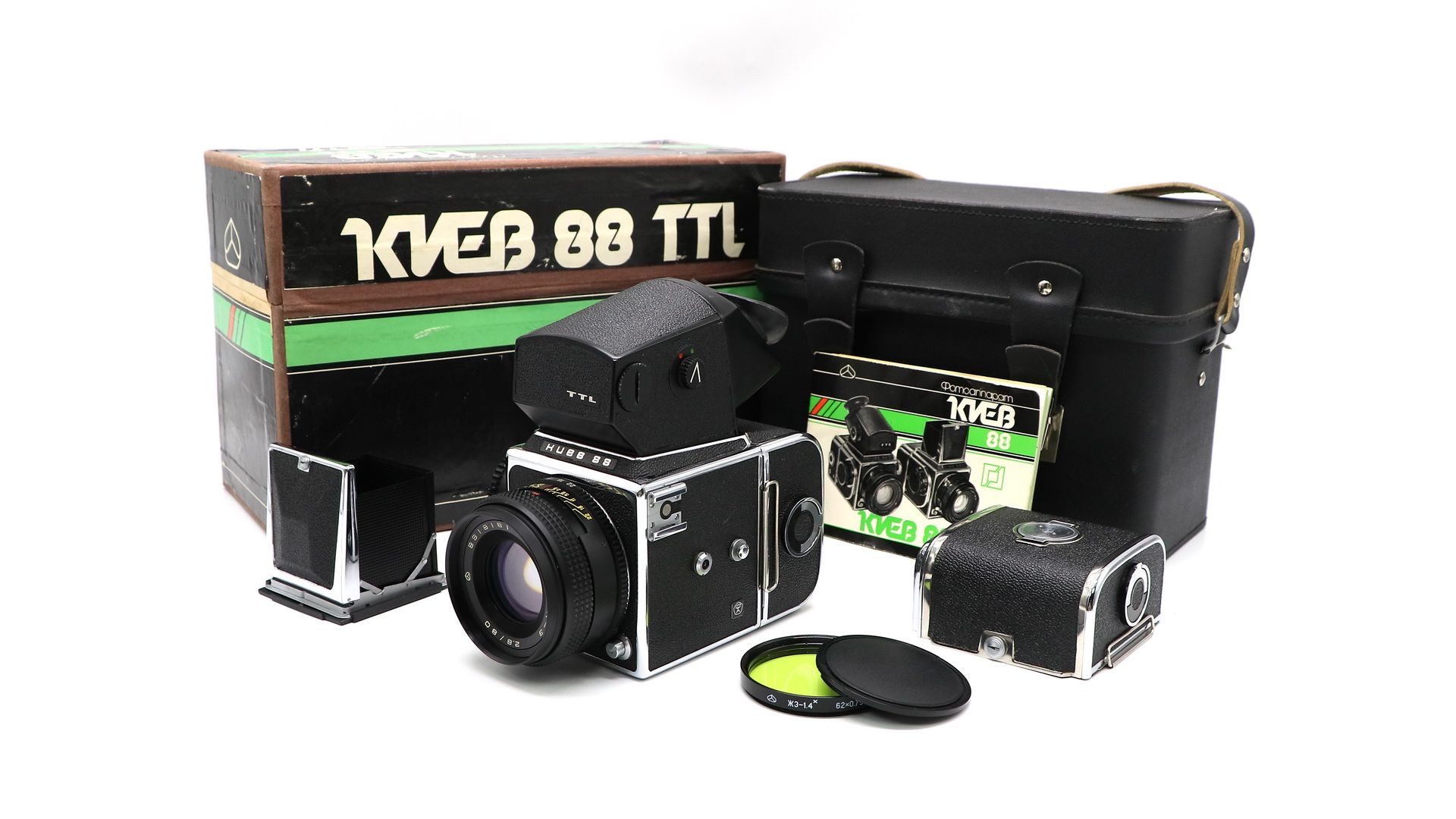 Фотоаппарат Киев-88 представляет собой модернизированный Салют-С с новым штатным объективом, усовершенствованной шахтой видоискателя и башмаком для крепления фотовспышки на корпусе. Фотоаппарат представляет модульную конструкцию с легко заменяемыми объективом, видоискателем и кассетой для фотоплёнки. Затвор шторный фокальный с диапазоном выдержек от 1/2 до 1/1000 с и «В». Размер кадра 6×6 см, на плёнке типа 120 получается 12 кадров.