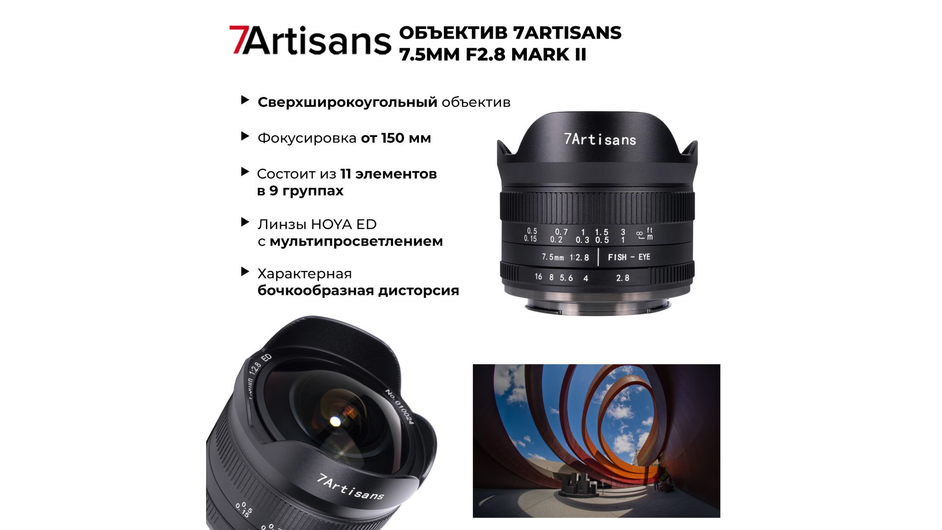 Усовершенствованная версия объектива типа «рыбий глаз» от 7Artisans. Обеспечивает угол обзора в 190°, с неисправленной дисторсией, что позволяет уместить в один кадр огромное пространство. Современные линзы HOYA ED с мультипросветлением позволят получить отличную цветопередачу. С обычным освещением объектив демонстрирует очень контрастную картинку с насыщенными цветами.