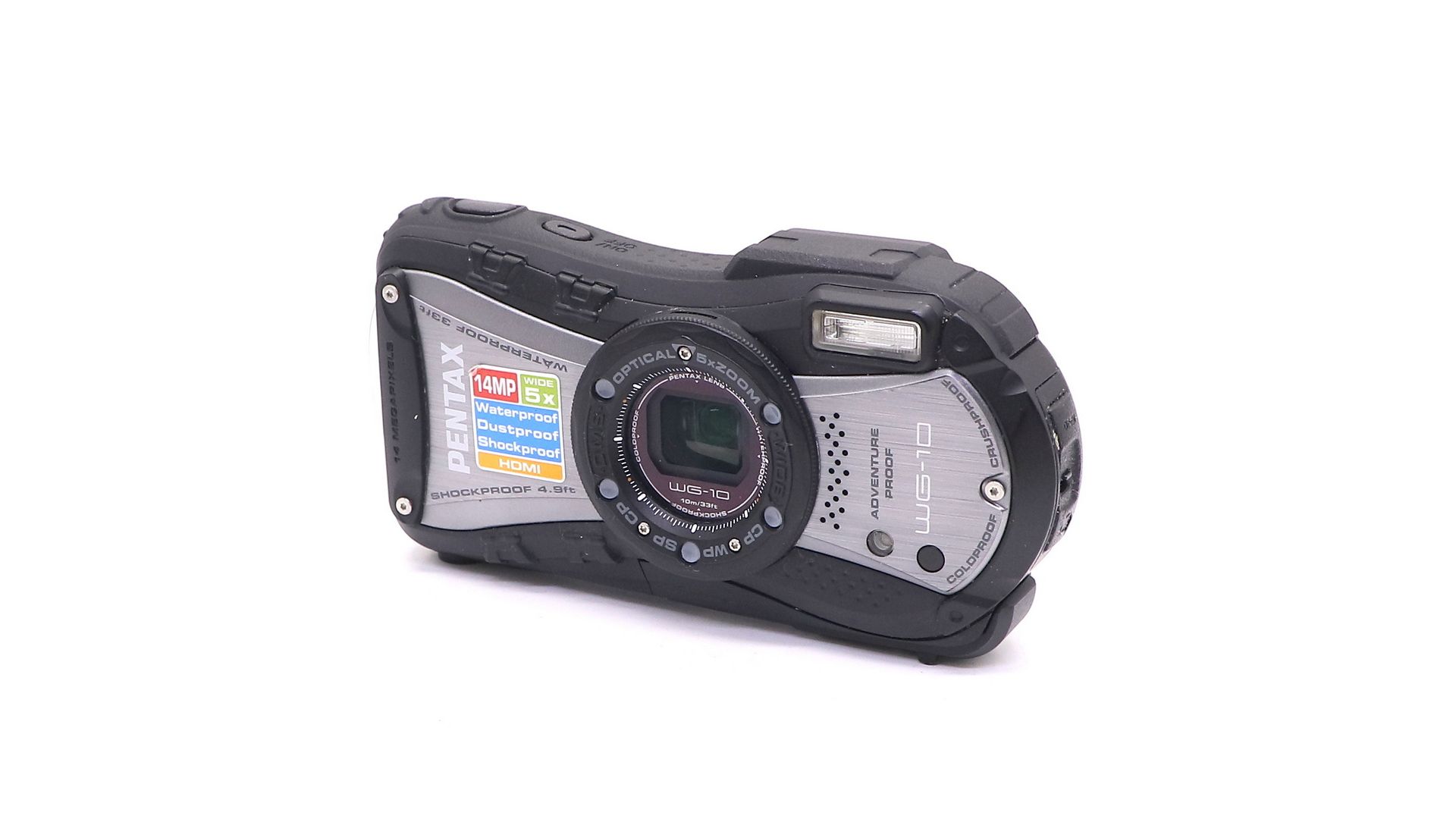 Камера WG-10 оснащена большим 2,7-дюймовым цветным ЖК-экраном с горизонтально расширенными пропорциями 16:9 и разрешением 230 000 точек. Фирменное антибликовое покрытие PENTAX AR (Anti-Reflection) сводит к минимуму раздражающие блики и отражения для обеспечения резкого и четкого изображения на экране даже под сильным солнечным светом. WG-10 оснащена пятикратным оптическим зум-объективом с диапазоном фокусных расстояний от 5 мм до 25 мм. Герметичный корпус WG-10 не только обеспечивает непрерывную двухчасовую работу в водонепроницаемом режиме на глубине до 10 метров ), но также является ударопрочным, пылезащищенным, морозоустойчивым и защищенным от сдавливания.